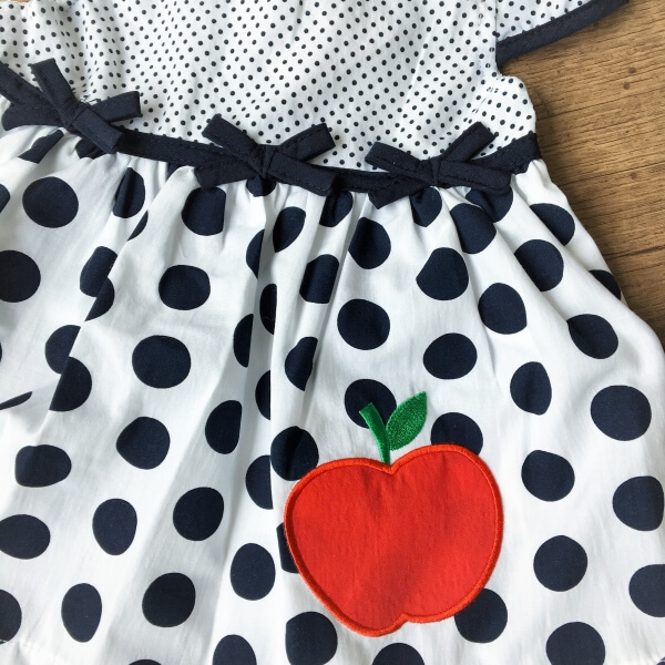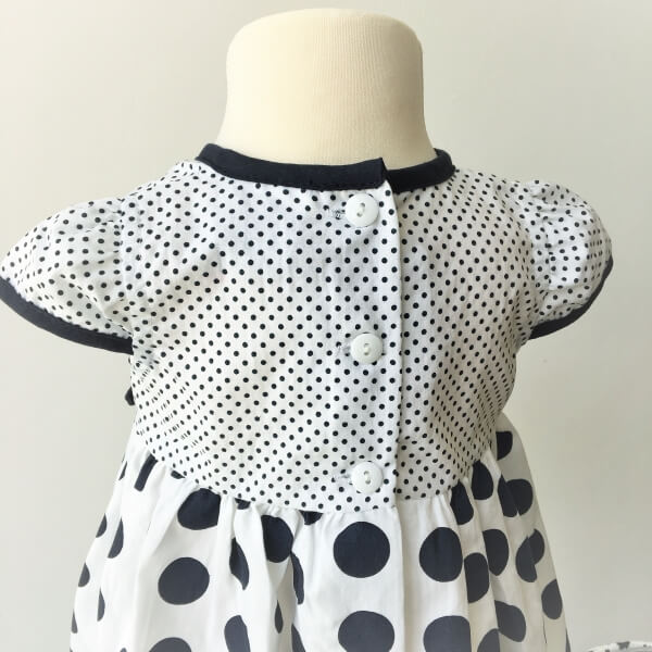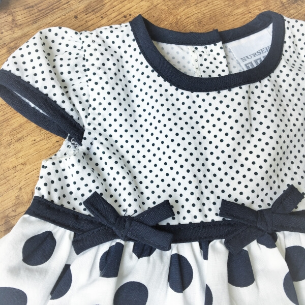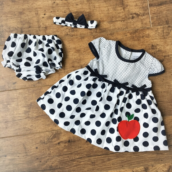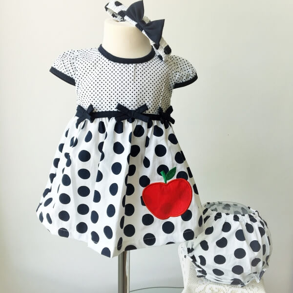Elegáns sötétkék pöttyös, 3 részes szett kislányok részére. A ruha felső része apró pöttyös, derekánál masnikkal díszített, szoknya része és a pelenkatakaró bugyi nagypöttyös anyagból készült. A kislány ruhát még divatosabbá teszi a szoknyát díszítő piros alma és masnis fejpánt. A rövidujjú ruha hátul gombos. Pontos centiméter adatok az életkor kiválasztása után jelennek meg.