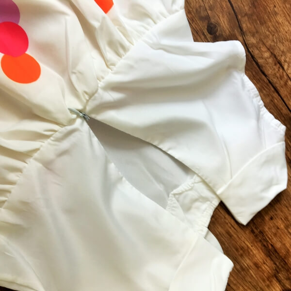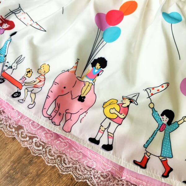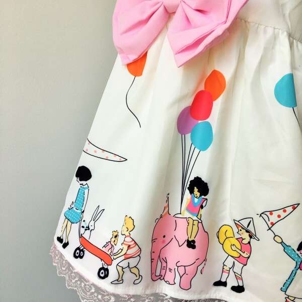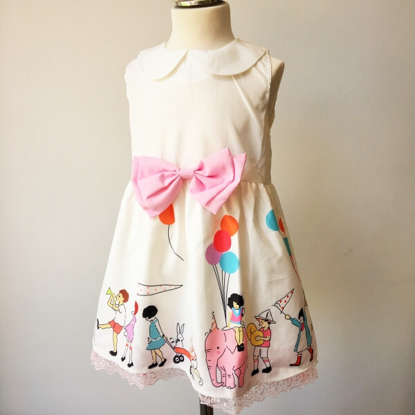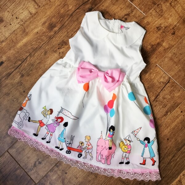 Könnyed nyári ruha születésnapra, esküvőre gyermekek részére. A fehér színű kislány ruha alját mesefigurák, elefánt és lufi díszíti. A ruha körgalléros, szoknya része vékony béléssel bélelt és felső része hátul cipzáros. Alkalmi jellegét a rózsaszín masni és szoknya aljára varrt csipke adja.
