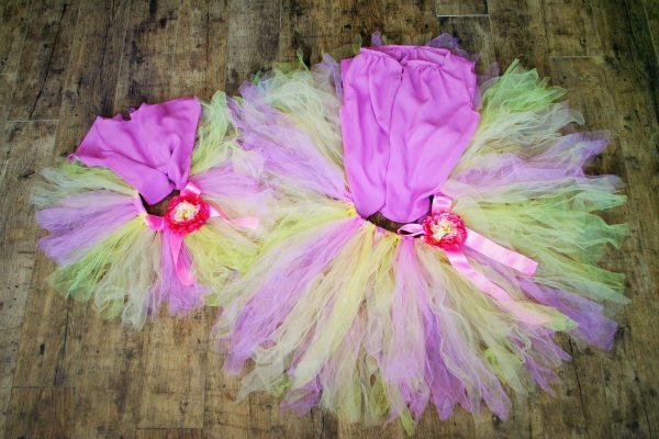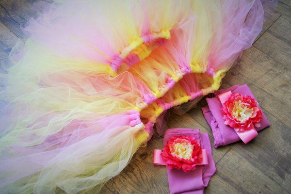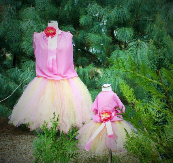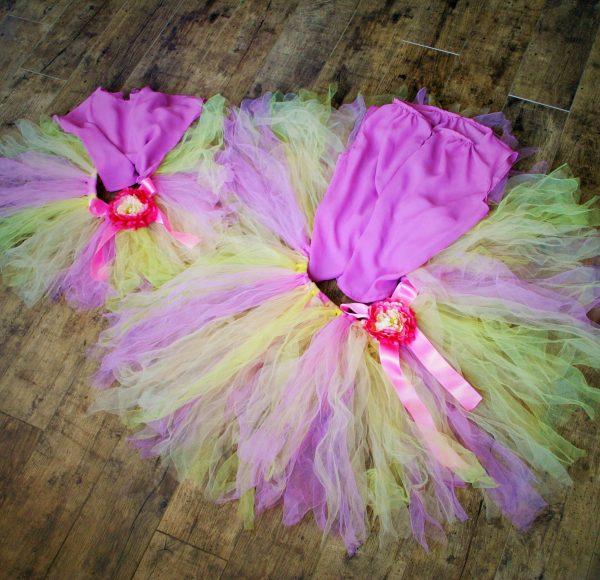 Anya- lánya tutu szett mályva és sárga színű tüll anyagból készült, az együttes tartalmazza a selyem szalagot és virág díszt, a muszlin anyagból készült blúzt nem tartalmazza a szett. Ha más méretben vagy színben szeretné megrendelni kérem írjon.