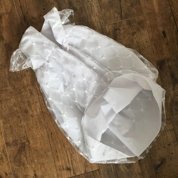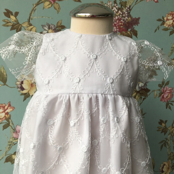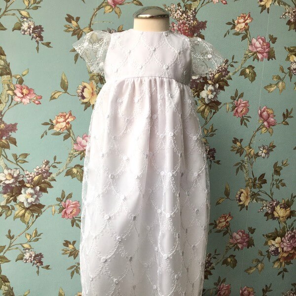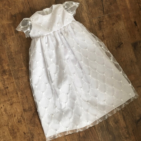 Hófehér hímzett csipkéből készült hosszított fazonú kislány keresztelőruha 1-9 hónapos méretekben. A lány ruha hátul cipzárral záródik, bélelt. Belső része hófehér puplin (ing) anyag, csipke része hálós, melyen a hímzés ezüstös szállal átszőtt, így a csillogás különleges megjelenést biztosít a ruhának. Pontos méretek a ruha kiterített állapotáról az életkor kiválasztása után jelennek meg. A ruha egyedi design alapján limitált darab számban készült saját márkás termék.