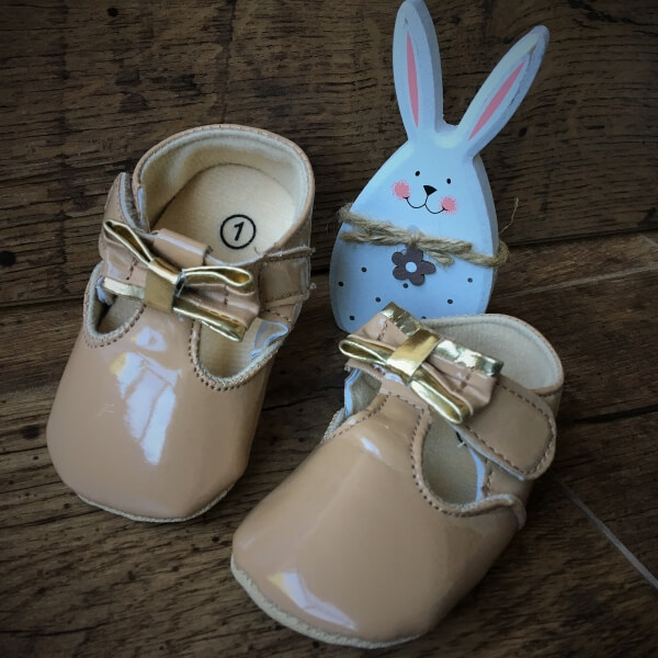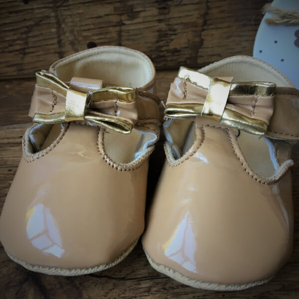 PU lakk műbőrből készült, aranyozott masnival díszített mogyoróbarna színű, elegáns kocsicipő 0-18 hónapos babák részére születésnapra, anyáknapjára, Húsvétra. A cipő belső része puha textillel bélelt, lábfején tépőzárral záródik, amelyet egy azonos anyagból készült masni díszít. A 3 méretben kapható cipő, külső és belső talphossz cm adatai a méret kiválasztása után láthatóak, a terméket ezután tudja a kosárba helyezni.