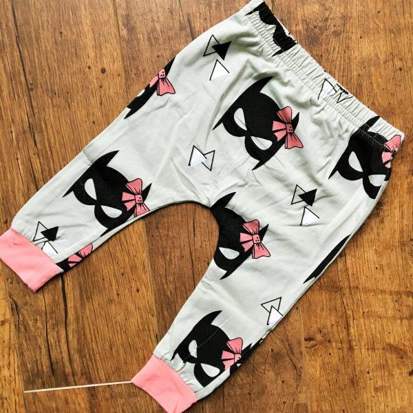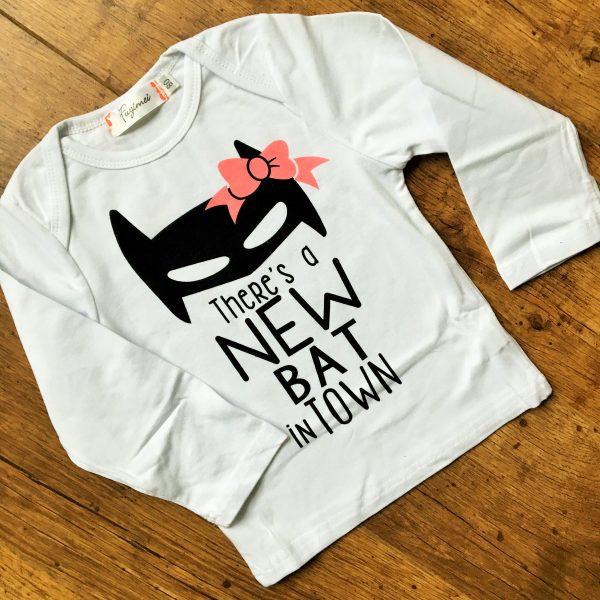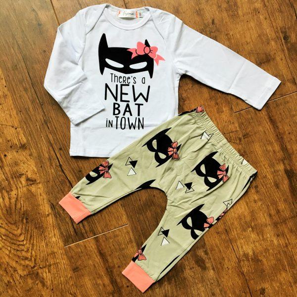A két részes Batman lány szett ‘There’s a NEW BAT in town’ felirattal kislányok részére ajánlott gyerekruha családi fotózáshoz. A szürke alapon fekete Batman maszk egy bájos rózsaszín masnival van dszítve, a hosszú ujjú felső pedig ugyancsak álarccal és a fenti felirattal rendelkezik. Ehhez az együtteshez hasonló fiú szettet is talál webshopunkban, így akár iker csecsemők részére is talál szettet gyerekruháink között.