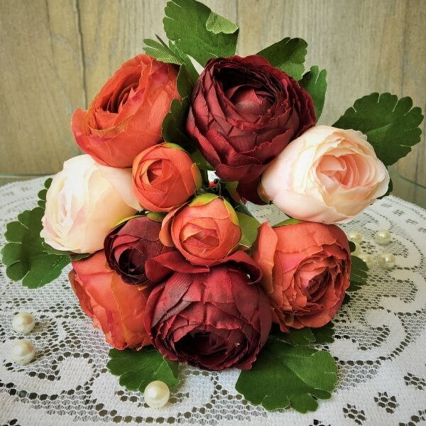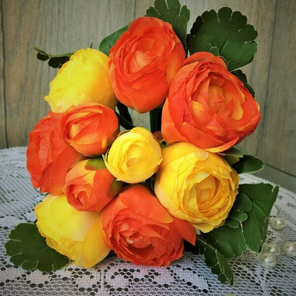 Boglárka selyemvirág csokor több színben, szalaggal összekötve. A dekoráció rendelhető bordó-rózsaszín és narancs-sárga színekben. Mindkét csokor 10 szál virágot és 7 levelet tartalmaz. Ideális húsvéti dekorációnak, fotózáshoz vagy ajándékba. Gyönyörű élénk színeivel és egyszerű formájával mindenkit elbűvöl.