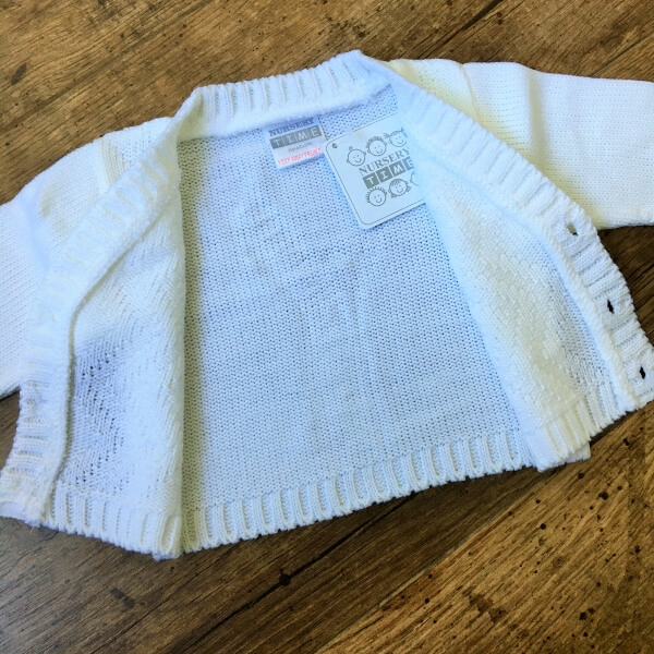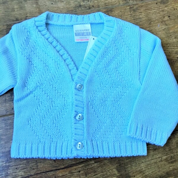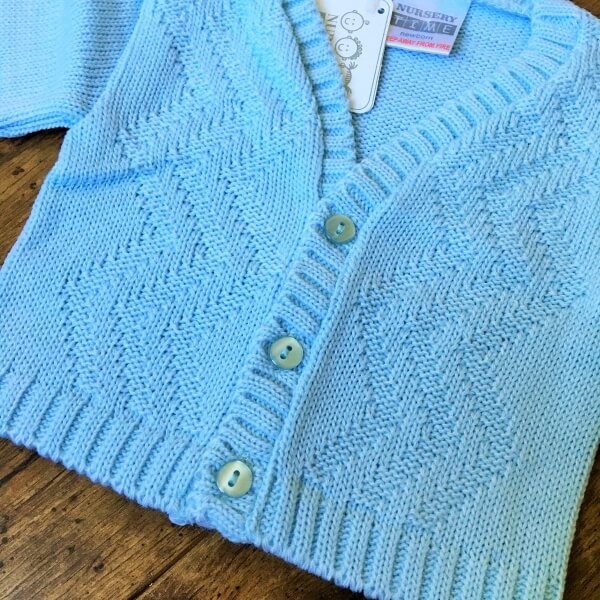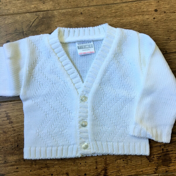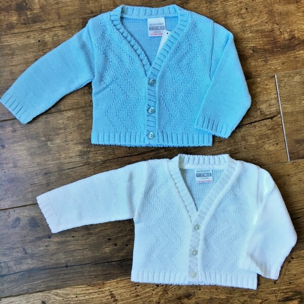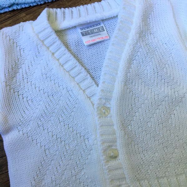 Fehér és világos babakék kötött kisfiú kardigán alkalmakra, cikk cakk mintával díszítve. A 0-24 hónapos babák részére több méretben készült kardigán három gombbal záródik. A 9-12 hónapos kardigán gyártói cimke alapján 6-12 hónaposnak van jelölve. A pontos cm adatok az életkor kiválasztása után jelennek meg, kérjük ellenőrizze gyermeke méreteit.