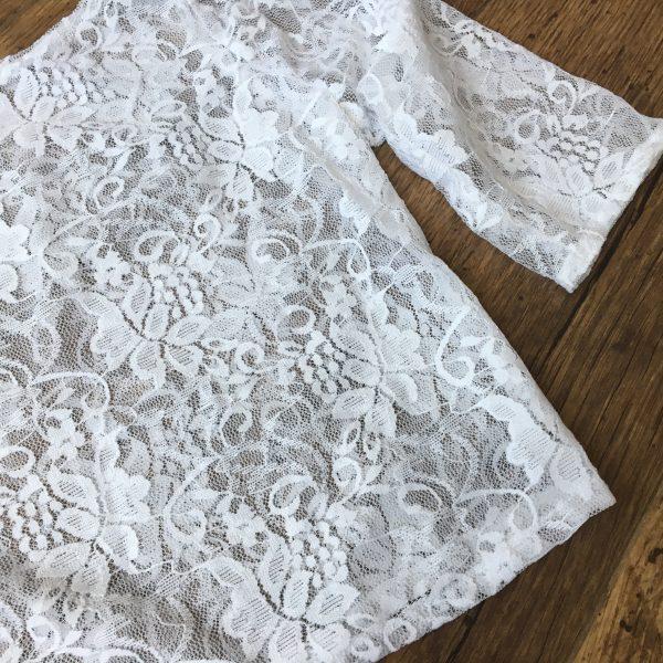 Babafotózáshoz ajánlott csipke blúz fehér színben elasztikus csipkéből. A blúz nyaka nem gombolós, ezért kérem a gyermeke méreteit ellenőrizze megrendelés előtt. A blúz pontos méretei lentebb a további információ között található. A blúz fotózási kellék, nem ajánlott mindennapi használatra.