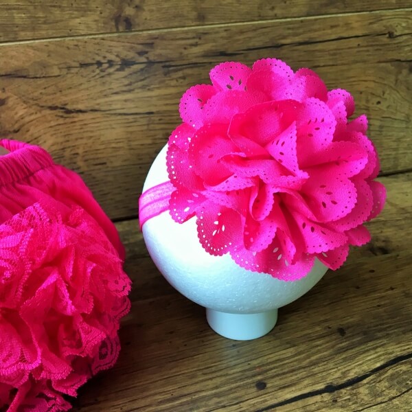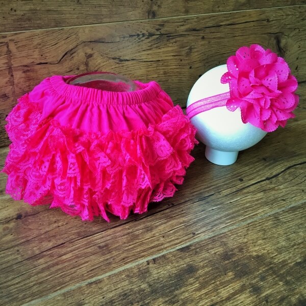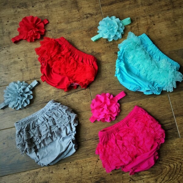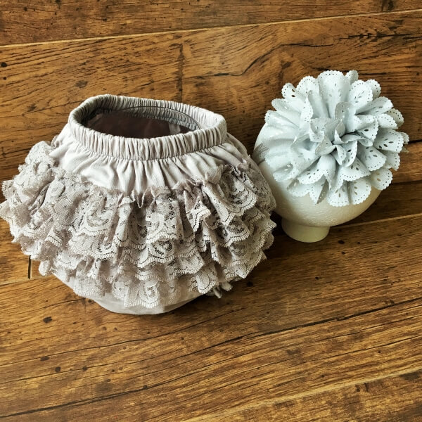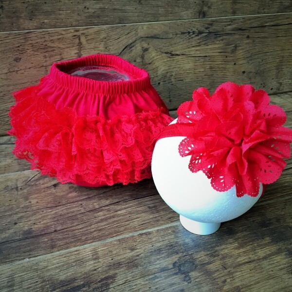 Puha pamut anyagból készült piros, pink, türkiz és szürke színű, csipkével díszített pelenkabugyi gyönyörű fejpánttal, fotózáshoz 0-12 hónapos csecsemők részére. Az azonos színű csipke a bugyi hátuljára 4 sorban van varrva. Derék és comb részen puha gumi található. A pelenkatakaró bugyi remek kiegészítő születésnapi vagy újszülött fotózáshoz.