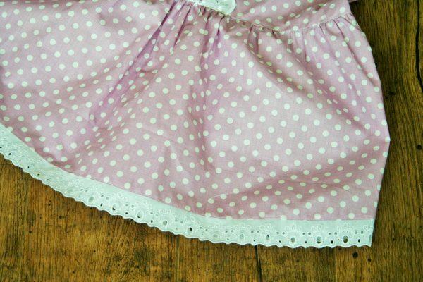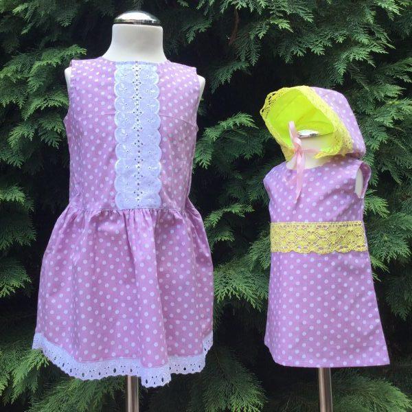 Halvány lila pöttyős, csipkével díszített pamutkarton ruha . Ideális választás fotózáshoz, anyák napjára, születésnapra, nyaraláshoz. A webshopban többféle színkombinációban elérhető, amennyiben nincs készleten kérem email-ben érdeklődjön a rendelésre gyártás feltételeiről.