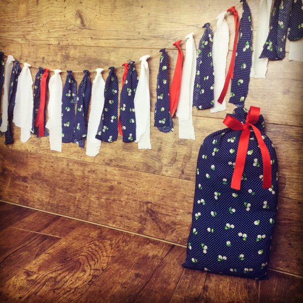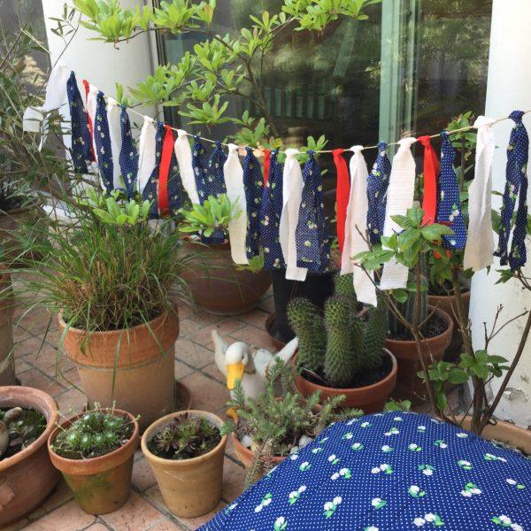 Kék, fehér és piros pamut vászon anyagból készült dekorációs füzér ideális nappali, teraszok, kertek dekorálására vagy akár családi fotózáshoz. A szett tartalmaz egy kisebb zsák formájú párnát, amelynek huzata nem eltávolítható. A szalagok újrahasznosított anyagból kerültek csomózással rögzítésre a füzéren. Vidám nyári dekoráció lakásba vagy kertekbe egyaránt. Amennyiben nagyobb méretre vagy több darabra lenne szüksége a kapcsolat menüben lévő űrlapon érdeklődhet.