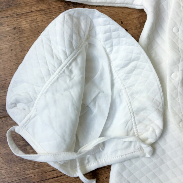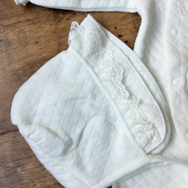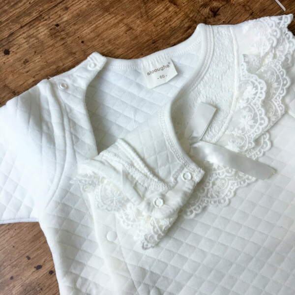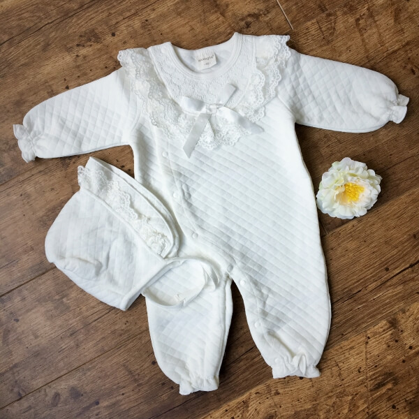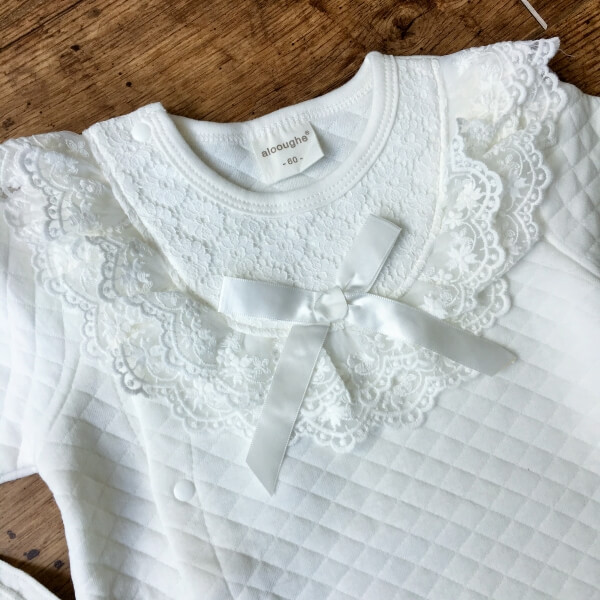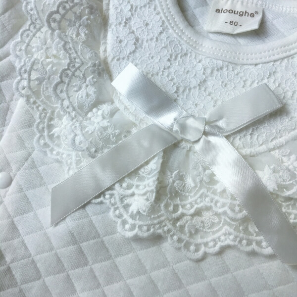 Törtfehér színű alkalmi, hosszú ujjú rugdalózó szett sapkával, babáknak keresztelőre. A rugdalózó elejét egy elegáns csipke betét díszíti. A baba kezeslábas vastag, téli viseletnek ajánlott. Patentos záródása lehetővé teszi, hogy alul nyitott baba zsákká alakítható legyen. A szett alapja egy önmagában kockás, steppelt hatású finom puha vastag anyag. Újja és boka rész gumival záródik. Belső része nem bolyhos.