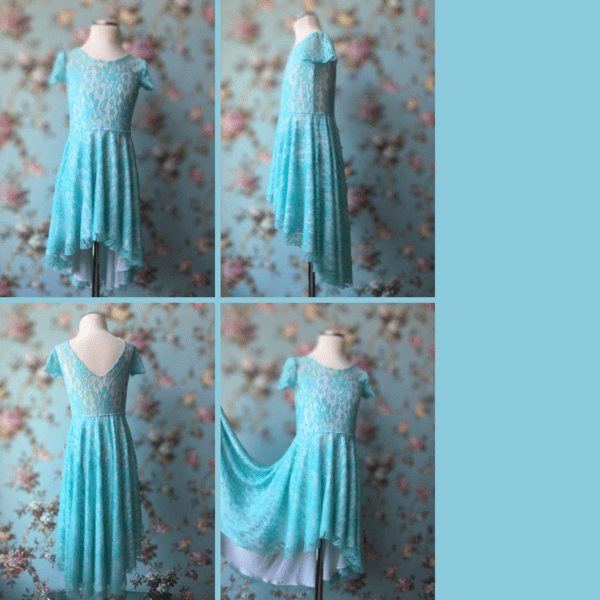 Mentazöld csipkéből és fehér viszkóz jerseyből készült, hátul hosszított fazonú, kör loknis alkalmi gyerekruha 1 hónapostól 6 éves korig. Vintage jellege miatt ajánlott esküvőre koszorúslányoknak, születésnapi fotózáshoz, keresztelőre vagy áldozásra. A lány ruha elasztikus, belebújós és hátán V alakban levágott. Pontos méretek a ruha kiterített állapotáról az életkor kiválasztása után jelennek meg. A ruha egyedi design alapján limitált darab számban készült saját márkás termék.
