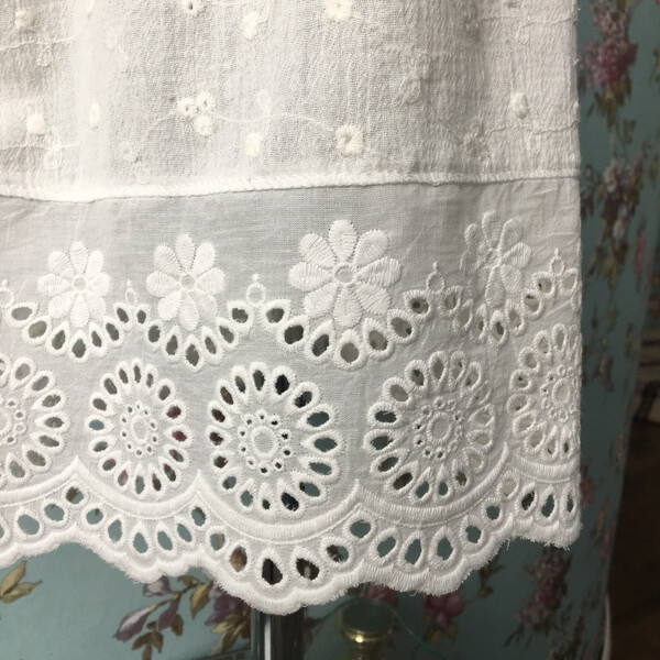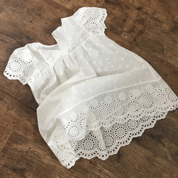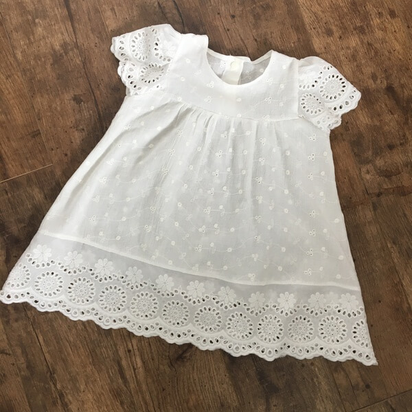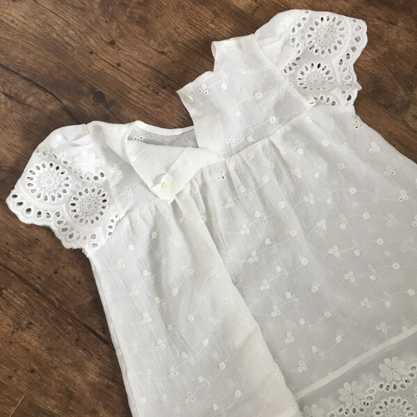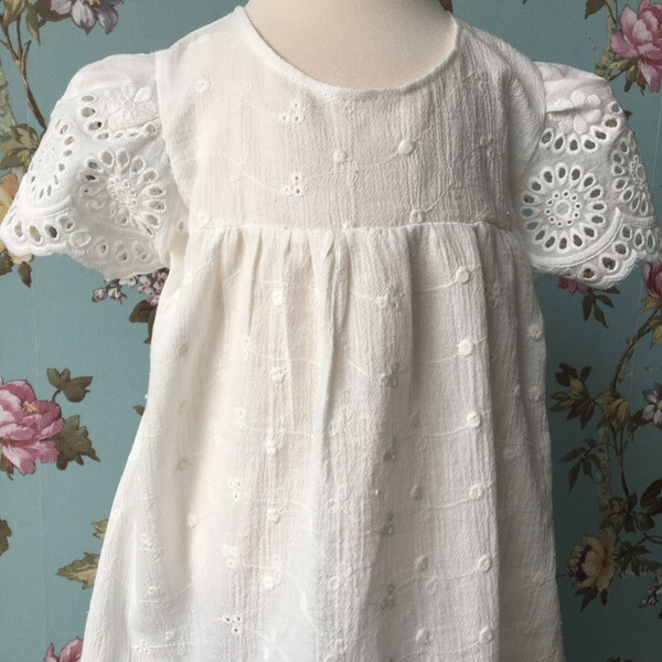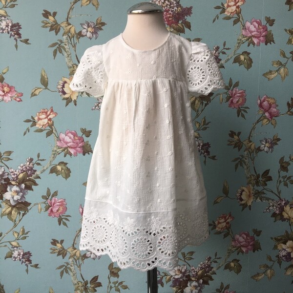 Törtfehér hímzett pamutból készült, madeira alkalmi gyerekruha 3 hónapostól 6 éves korig. Vintage jellege miatt ajánlott esküvőre koszorúslányoknak, születésnapi fotózáshoz, keresztelőre vagy áldozásra. A lány ruha hátul patenttal záródik, anyaga enyhén gyűrt, nagyon puha és könnyű anyag. Pontos méretek a ruha kiterített állapotáról az életkor kiválasztása után jelennek meg. A ruha egyedi design alapján limitált darab számban készült saját márkás termék.