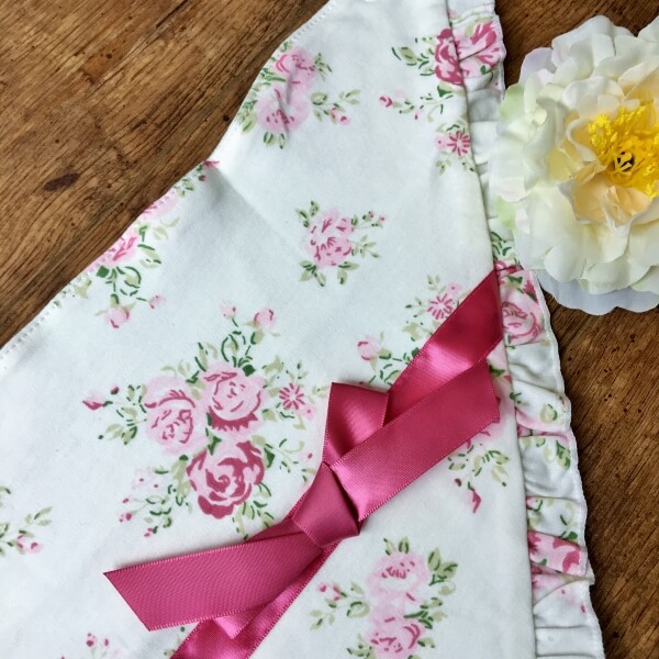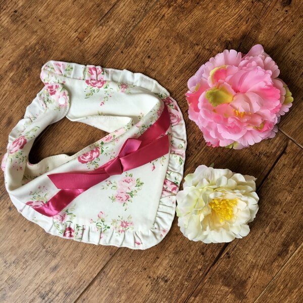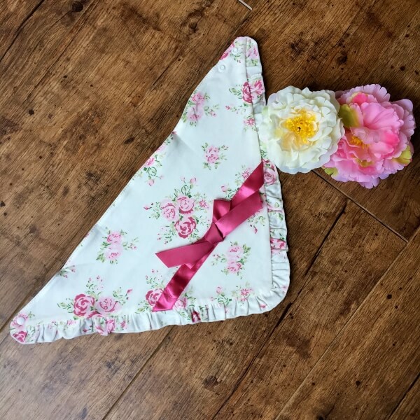 Rózsa mintás, fodros szélű gyönyörű alkalmi nyáékendő babáknak. A kendő patenttal kapcsolható, 2 fokozatban lehet állítani.