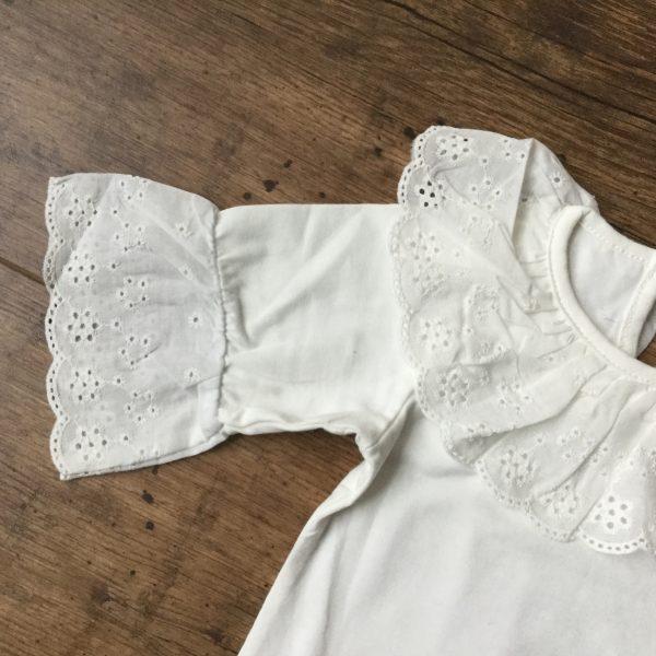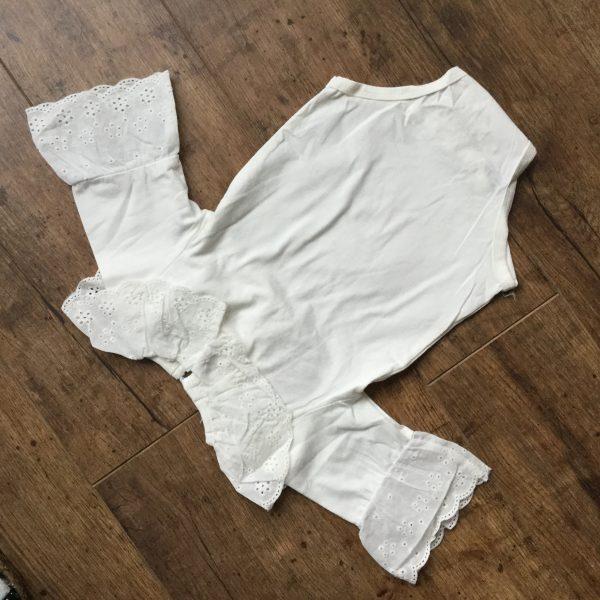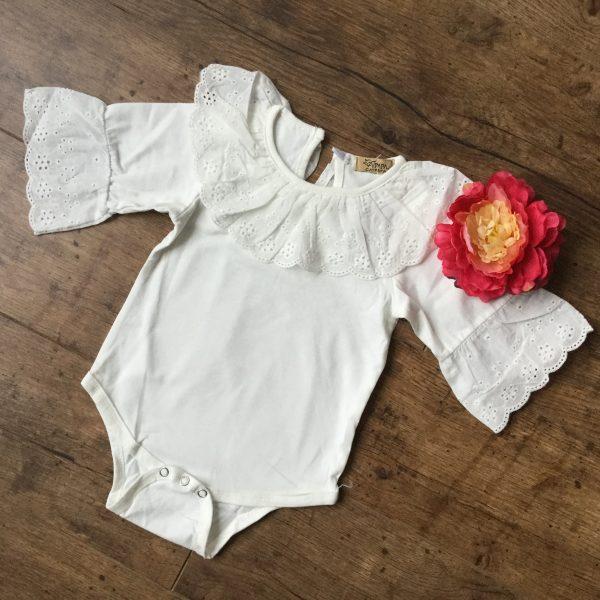 Fehér színű csipke galléros és csipke ujjú body kislányoknak, ajánlott keresztelőre vagy egyéb alkalmakra, mint például esküvő vagy születésnap. Ez a gyönyörű gyerekruha bármilyen színű alsóval viselhető, ajánlunk hozzoá fehér színű tütü szoknyát, ha kerszetelő szettet szeretne összeállítani. Fotózáshoz sokféle fejpánt és kiegészítő közül válogatha. Ezzel a csodás lány felsővel elragadó vintage képeket készíthet gyermekéről.