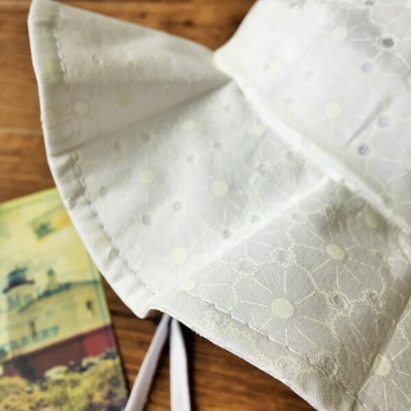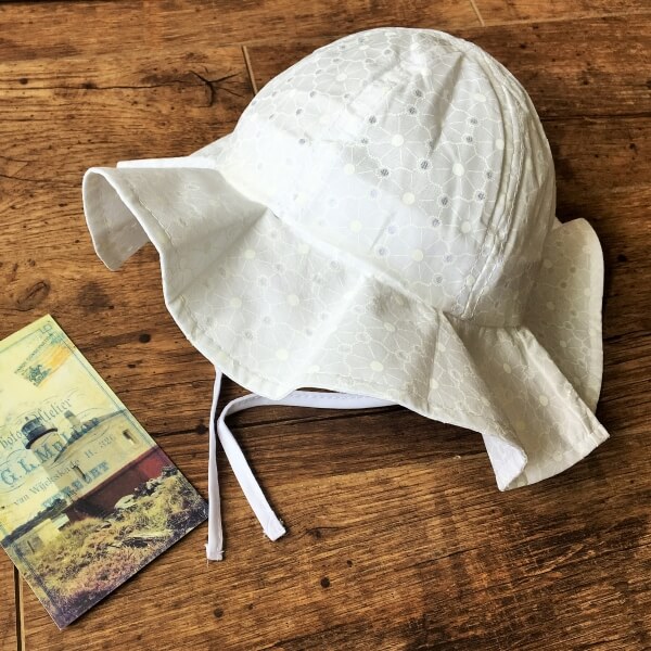 Fehér színű klasszikus nyári kalap babáknak vékony anyagból készült. Apró nyomott virágokkal díszített, rövid 23 cm-es megkötővel biztosíthatja a kalapot gyermeke fején.