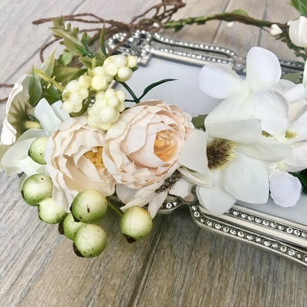 Virágos, barack színű hajkoszorú esküvőre, családi fotózáshoz, koszorús lányoknak. A virágos kiegészítő merev részéhez a selyem virágok, rózsa és levelek erősen rögzítve vannak, a szállítás után a virágok kiigazítása szükséges. A koszorú organza szalaggal tetszőleges fejméretre állítható. Több darab 4-6 cm átmérőjű barack és fehér színű virágok találhatóak a koszorún. Monitortól függően a színárnyalat eltérhet a képen láthatótól. Amennyiben nincsen készleten kérem a kapcsolat menü alatt érdeklődjön a rendelés részleteiről.