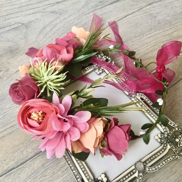Virágos, pink színű hajkoszorú esküvőre, családi fotózáshoz, koszorús lányoknak. A virágos kiegészítő merev részéhez a selyem virágok, virágok és levelek erősen rögzítve vannak, a szállítás után a virágok kiigazítása szükséges. A koszorú organza szalaggal tetszőleges fejméretre állítható. Több darab 4-6 cm átmérőjű lila színű virágok találhatóak a koszorún. Monitortól függően a színárnyalat eltérhet a képen láthatótól. Amennyiben nincsen készleten kérem a kapcsolat menü alatt érdeklődjön a rendelés részleteiről.