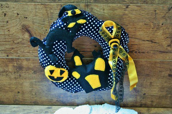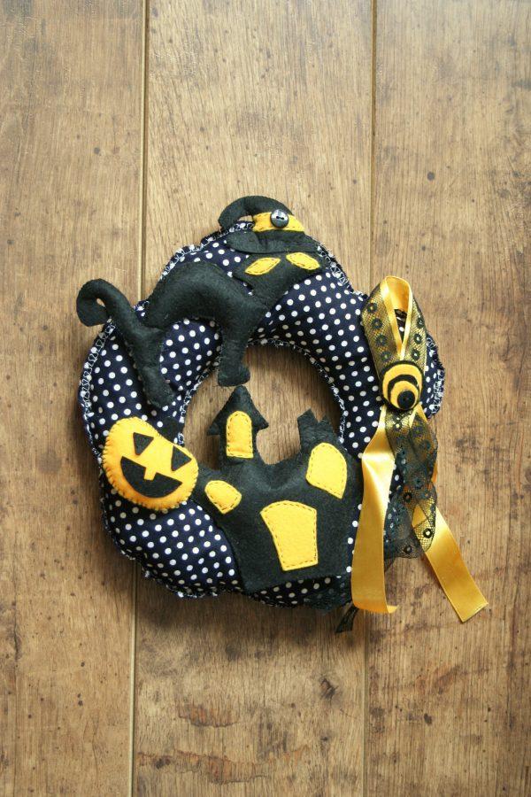 Bejárati ajtóra, lakás díszítésre ajánlott fekete macskás ajtódísz, fekete-fehér pöttyös pamut koszorú alapon különböző Halloween témájú filcből készült díszek vannak. A dekorációt használhatja ajtó díszítésére vagy konyhai kiegészítőként is az ünnepek alatt. A koszorú átmérője 27 cm x 25 cm, súlya 45 gramm. Díszek kísértetház, fekete macska, tök és szalag, melyek egyedileg tervezettek és kézzel varrottak. A koszorú és a filc díszek párnatöltelékkel vannak töltve.