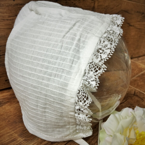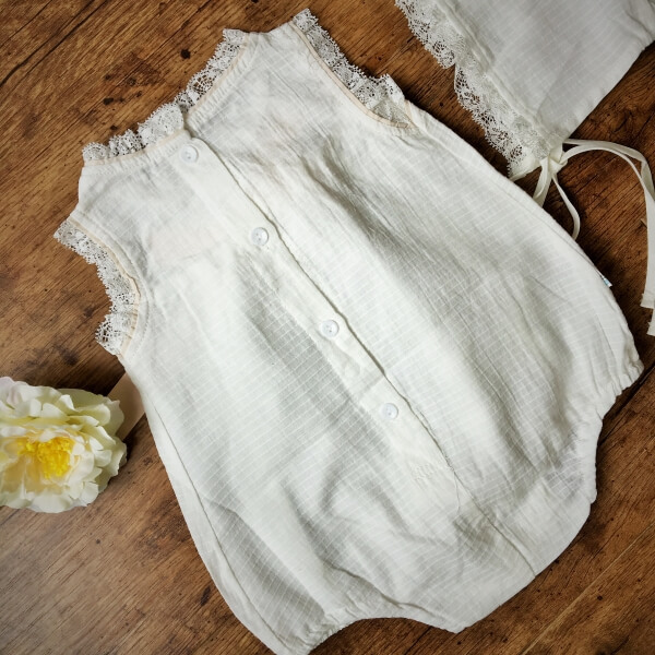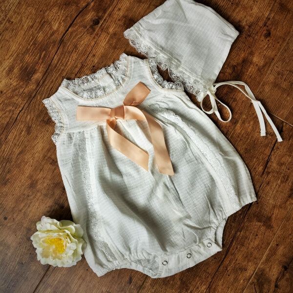 Nyári ujjatlan rugdalózó sapkával keresztelőre, alkalmakra. A rugdalózó törtfehér és gyönyörű csipke betéttel díszített az eleje, nyaka és karöltője. A nyakánál barack színű szatén szalaggal díszített. Anyaga vékony könyű puha pamut, ezért nyári viseletnek ajánlott. Háta gombos, alul patentos a comb rész gumival záródik.