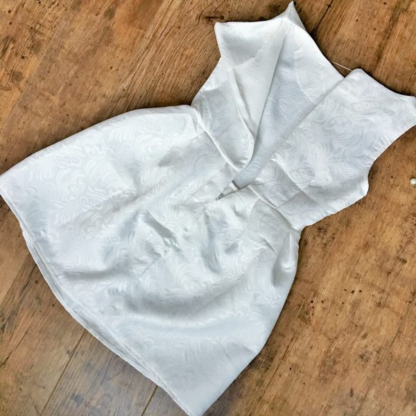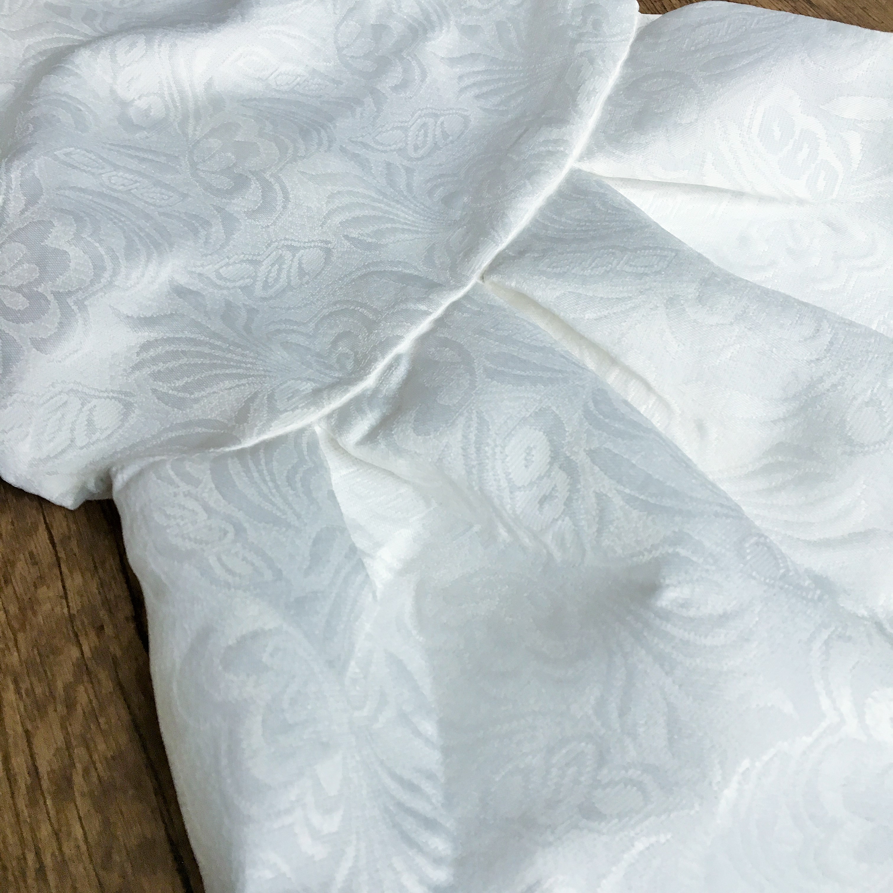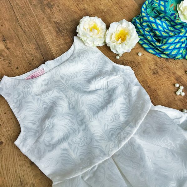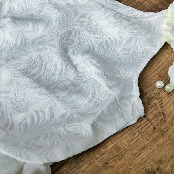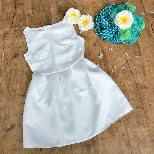 Egyszerű szabású fehér színű damaszt lány ruha 9-13 éves kislányoknak áldozásra, koszorúslány ruhának, születésnapra, alkalmakra. A gyerekruha hátul cipzáros, beső része nem bélelt. Színes kiegészítőkkel akár születésnapi vagy családi fotózáshoz is használható. A ruha gyönyörű mintás vastag damaszt anyagból készült, elegáns viselet gyermeke számára.