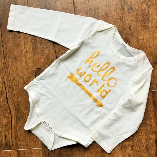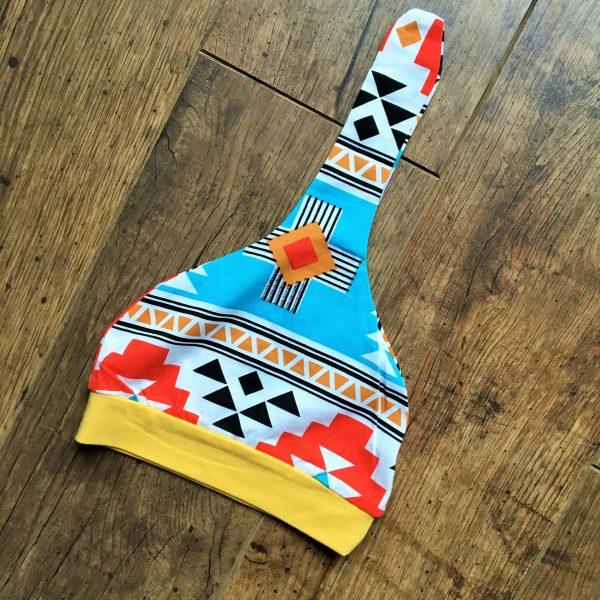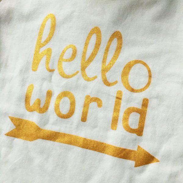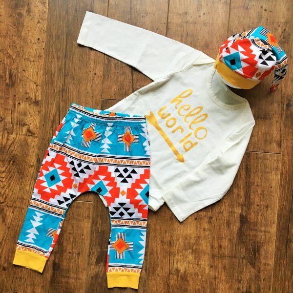A türkiz és piros színű, inka mintás ayagból készült ‘Hello World’ feliratos 3 részes fiú szett sapkával, kisfiúk részére ajánlott. A nadrág dereka gumis, a szetthez a nadrággal azonos anyagból készült sapka is tartozik. A fehér színű, hosszú ujjú gyerek body-n arany színnel egy rávaslaható felirat és egy nyíl található. Az egyedi inka mintás együttessel remek születésnapi, sátras képeket készíthet gyermekéről.