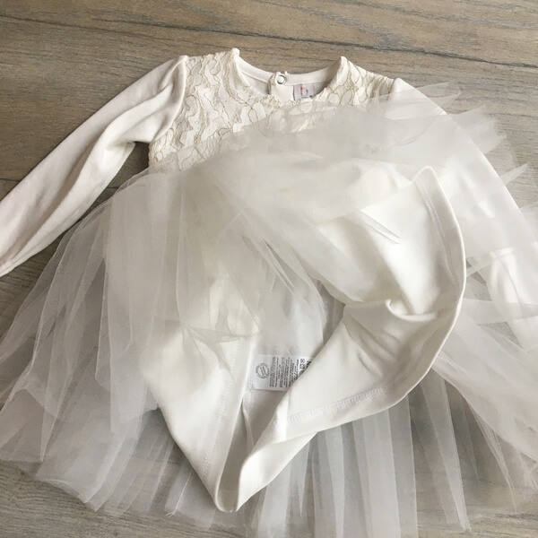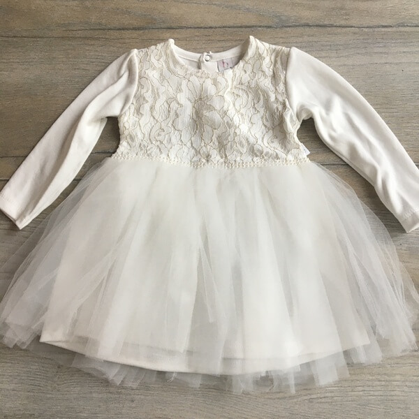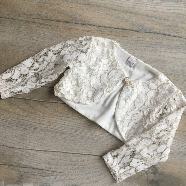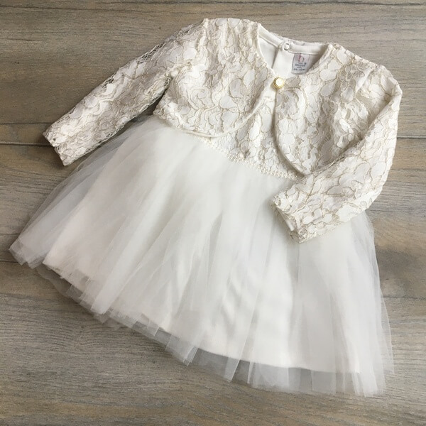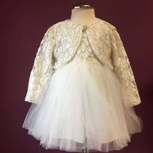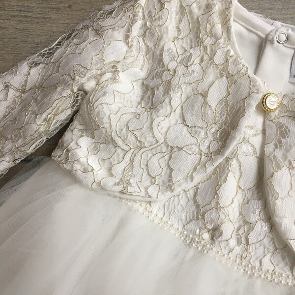 Egyszerű, elegáns és kényelmes törtfehér kislány alkalmi ruha boleroval keresztelőre, esküvőre, szülinapi fotózáshoz. A hosszú ujjú, rugalmas jersey anyagbólkészült gyerekruha 6-18 hónapos méretekben készül. Az alkalmi lányka ruha eleje felsőrésze csipkés, hátul patentos, alsó része 2 rétegű tüllel, dereka elején gyöngypatenttal díszített. A csipke bolero anyagában aranyszál díszítés található.