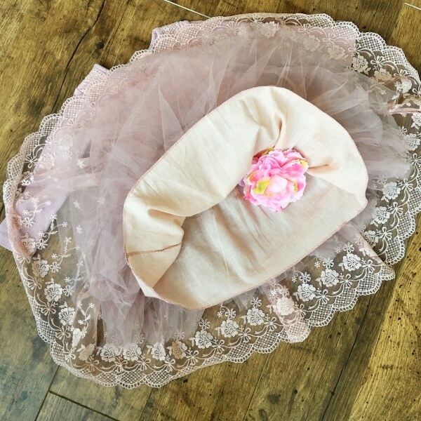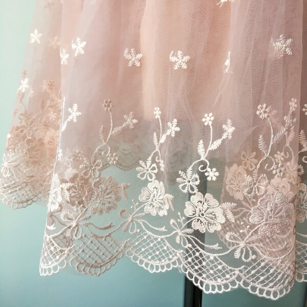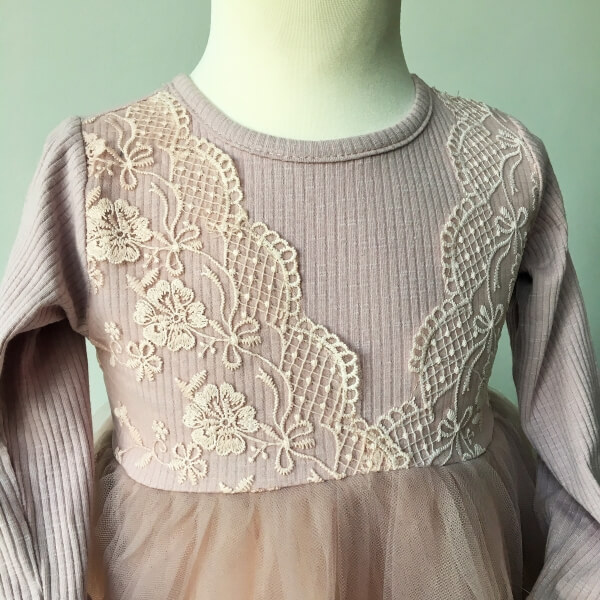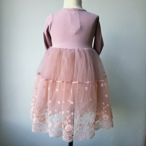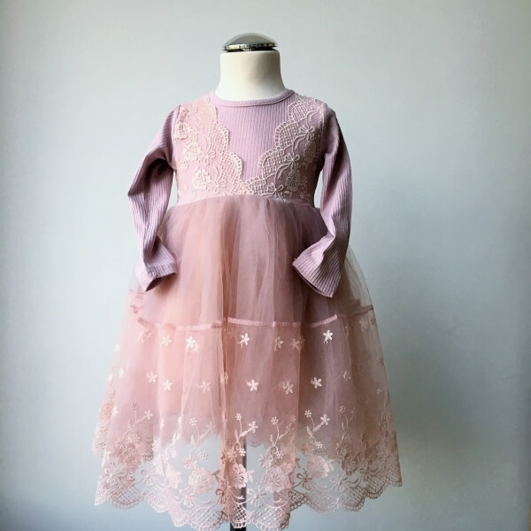 Mályva színű, tüllel és csipkével díszített, hosszú ujjú alkalmi kislány ruha 3-9 éves korosztály részére. A ruha felső része kötött, ezért téli viseletre, esküvőre vagy karácsonyra is ajánljuk. A szoknya része egy pamutos alsószoknyából és 4 réteg fátyol tüllből áll. A felső tüllréteg alját egy gyönyörű rávarrt, 23 cm magas hímzett csipke díszíti.