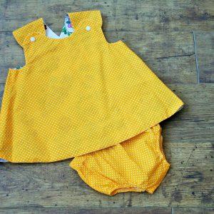 Kalocsai mintás sárga színű kifordítható kötényruha, színben hozzá illő pelenkabugyival. Kényelmes nyári viselet, ideális retro, vintage fotózáshoz is. A webshopban többféle színkombináció elérhető, amennyiben ezektól eltérő mintával szeretne rendelni, kérem email-ben érdeklődjön.