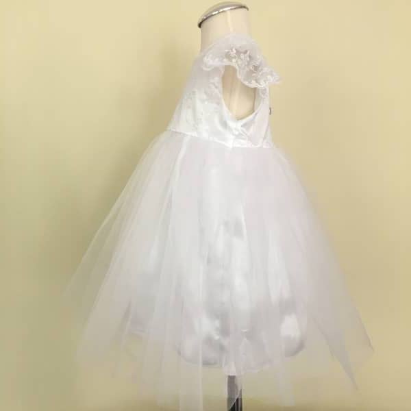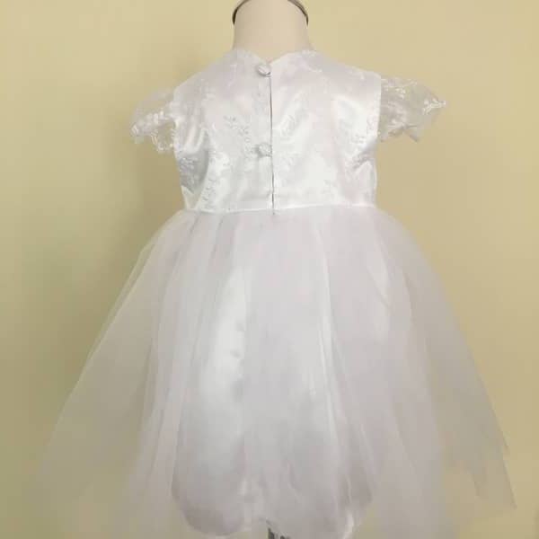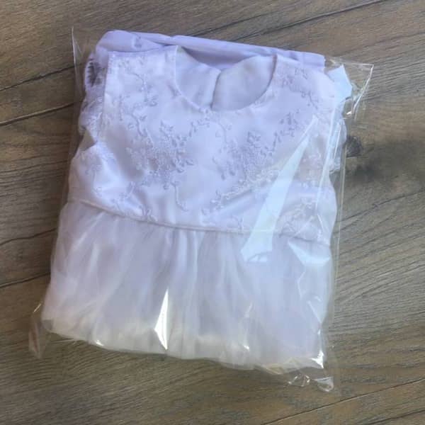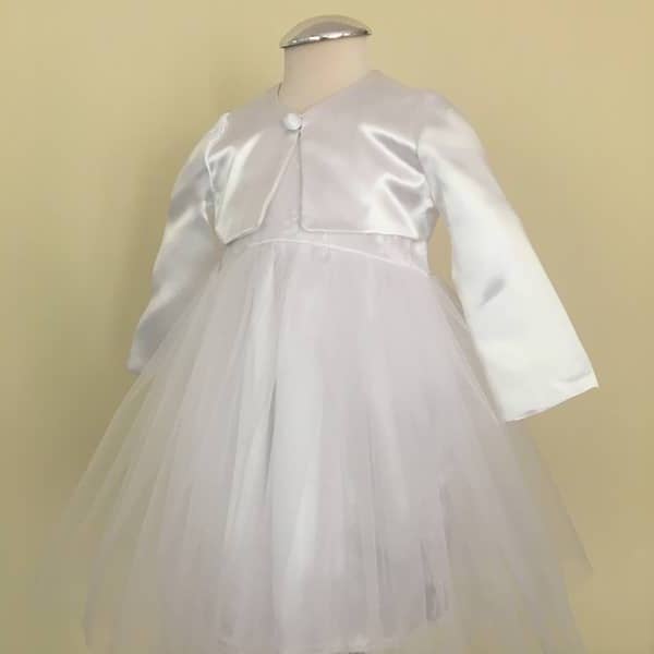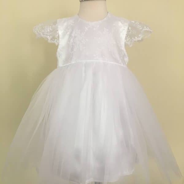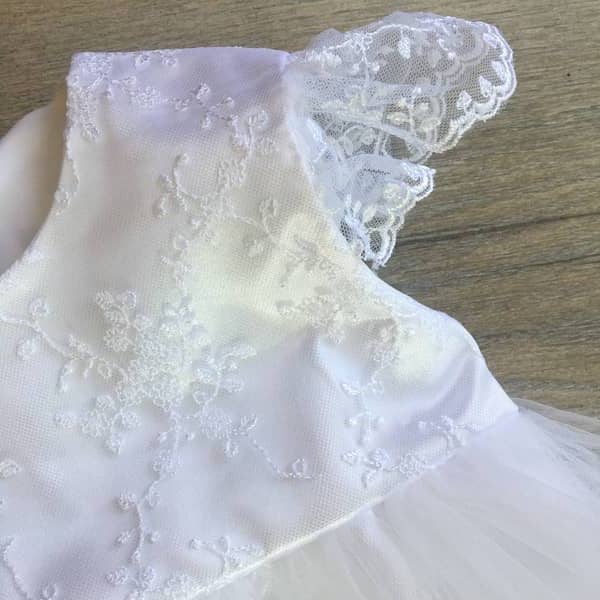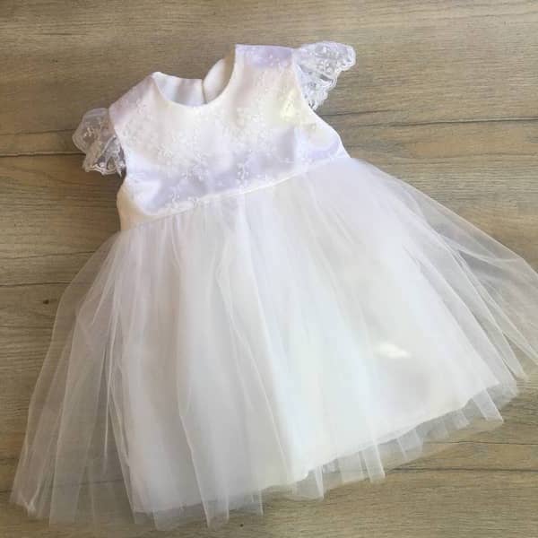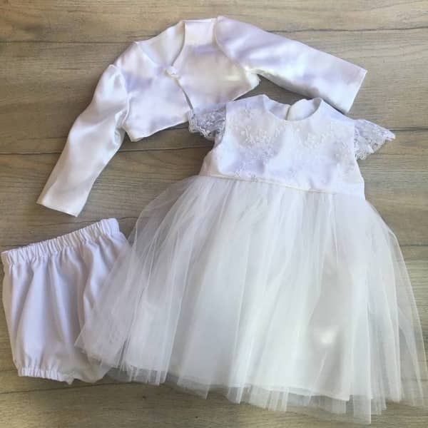 Három részes hófehér kislány keresztelő szett, tüllös hímzett csipkével díszített felsőrésszel. A szett részei: csipkés, tüllös ruha, boleró, rövidnadrág (bugyi).