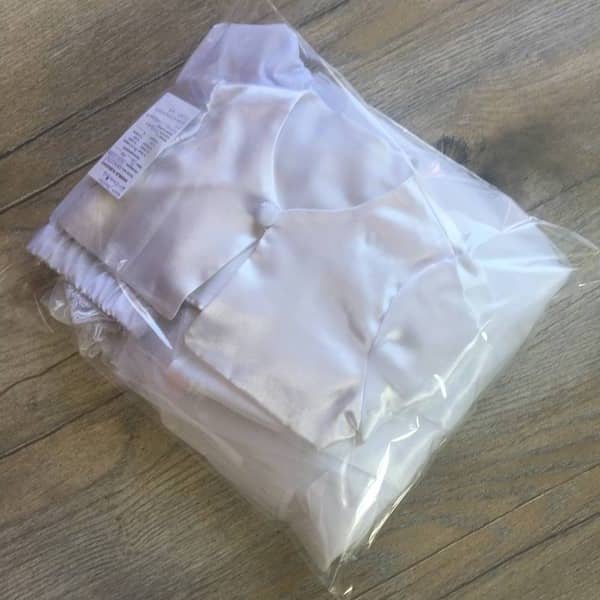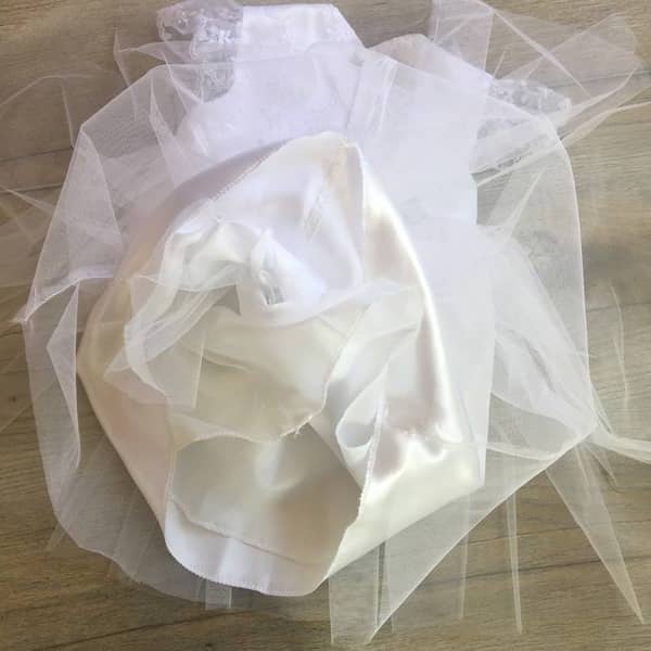 A ruha felső része bélelt, a külső szatén részt tüllös hímzett csipke borítja. Alsó (szoknya) része 5 rétegű, rétegek: bélés selyem, 1 réteg tüll, szatén és felül 2 réteg tüll. A bélelt fényes szatén boleró felül 1 db, a ruhával azonos csipkével bevont gombbal záródik. A ruha háta szintén a ruha csipkéjéből készült 2 db bevont gombbal záródik. A pelenkatakaró kis rövidnadrág (bugyi) puplin anyagból készült, dereka és comb része gumírozott.