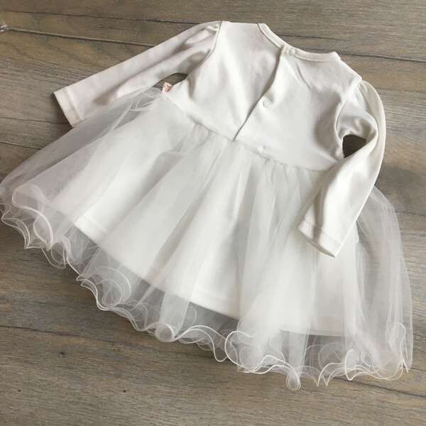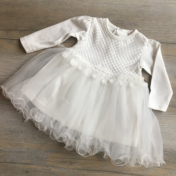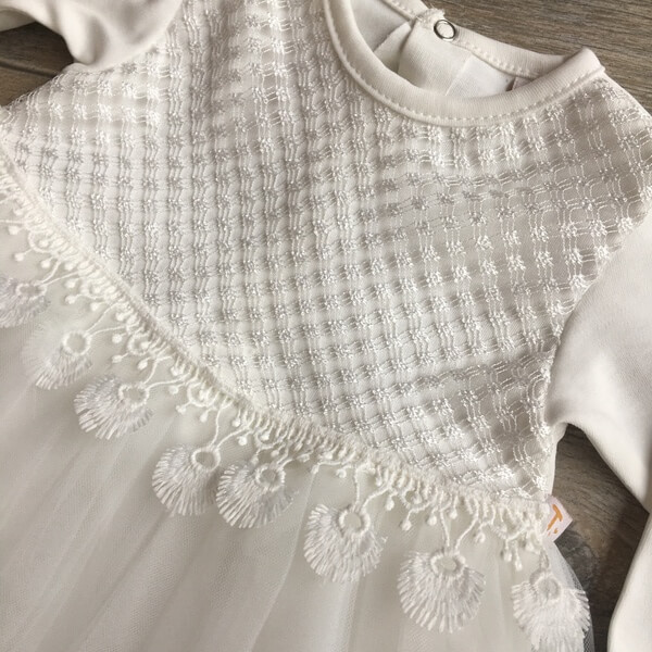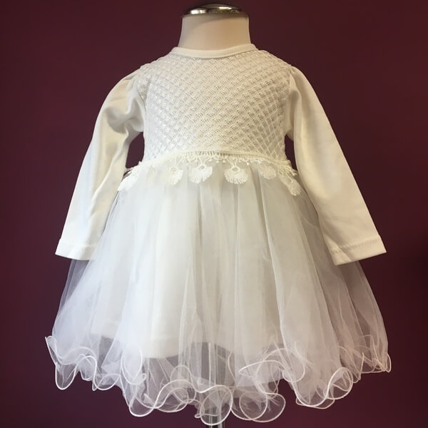 Egyszerű, elegáns és kényelmes törtfehér kislány alkalmi ruha csipke felsőrésszel keresztelőre, esküvőre, szülinapi fotózáshoz. A hosszú ujjú, rugalmas jersey anyagbólkészült gyerekruha 6-18 hónapos méretekben készül. Az alkalmi lányka ruha hátul patentos, alsó része 2 rétegű fodrozott tüllel, dereka elején csipkeszalaggal díszített.