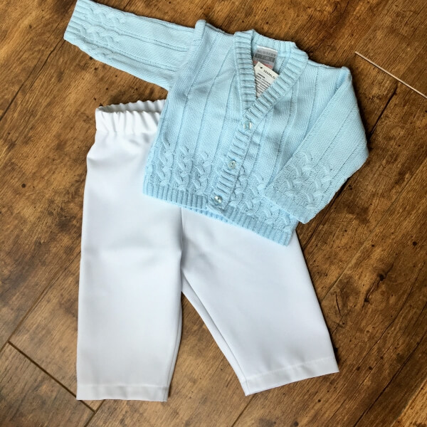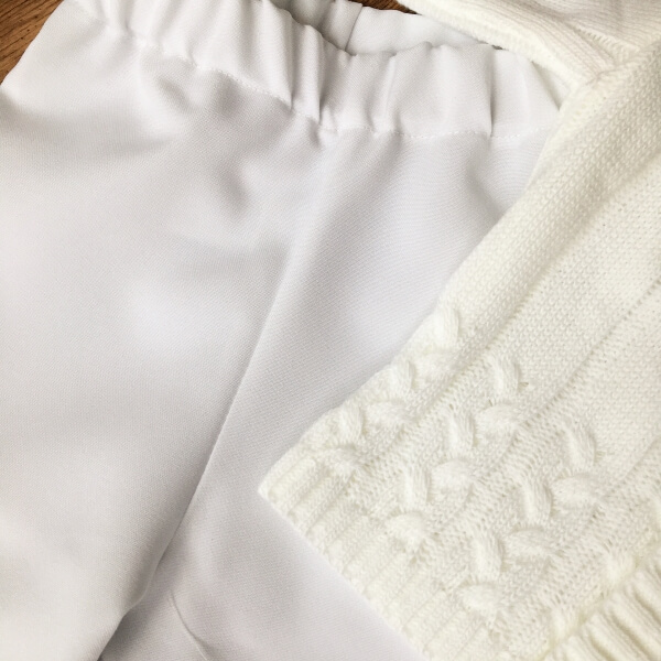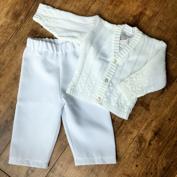 Hófehér szövet nadrág kisfiúknak keresztelőre, alkalmakra. A nadrág puha gumis derekú, a termék pontos cm adatai az életkor kiválasztása után megjelennek, kérjük ellenőrizze rendelés előtt gyermeke méreteit. Az ár csak a nadrágot tartalmazza, a képeken szereplő kardigánt szintén megtalálja webshopunkban, de azt külön kell a korásrba helyezni.
