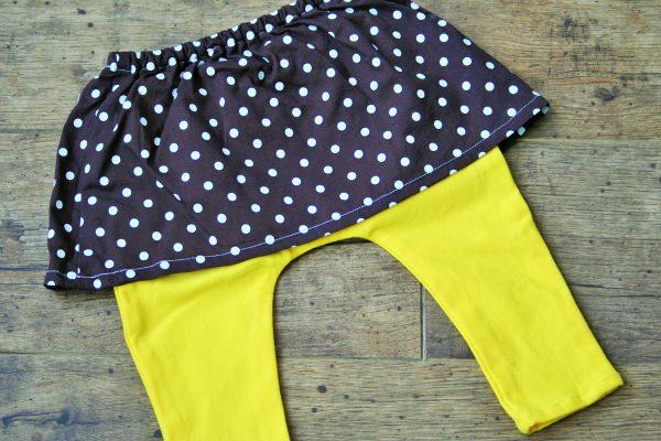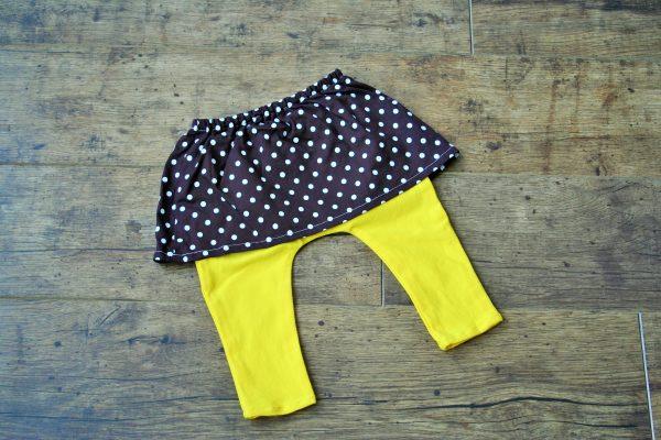 Élénk sárga pamut nadrág barna pöttyös szoknyával. Nagyon puha kényelmes pamut anyagból készült nadrág pamutkarton rávarrt szoknyával, ideális fotózáshoz, de hétköznapi használatra is.