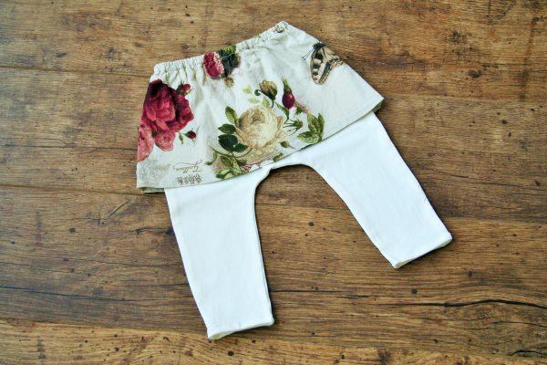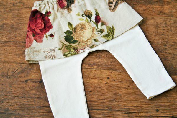 Vajszínű pamut nadrág rózsa mintás szoknyával. Nagyon puha kényelmes pamut anyagból készült nadrág pamutkarton rávarrt szoknyával, ideális fotózáshoz, de hétköznapi használatra is.