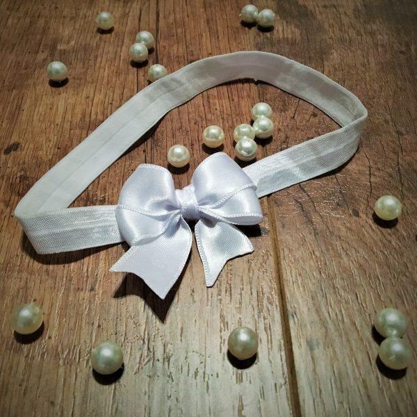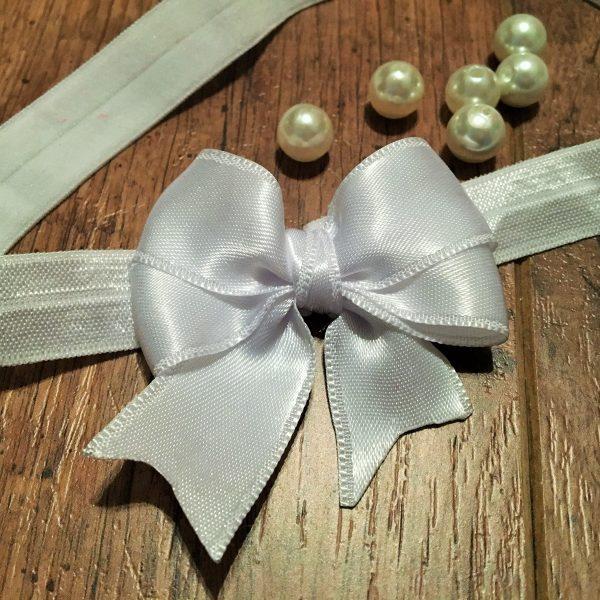 Fehér színű selyem szalagból és puha gumiból készült baba fejpánt keresztelőre vagy újszülött babafotózáshoz, és egyéb alkalmakra és ünnepekre ajánljuk. A masni kézzel készült és varrással van rögzítve a gumis fejpántra. Pontos méret a lenti további információk rovatban található. Amennyiben nincsen készleten vagy más színben, méretben szeretne rendelni kérem a kapcsolat menü alatt található űrlapon érdeklődjön.