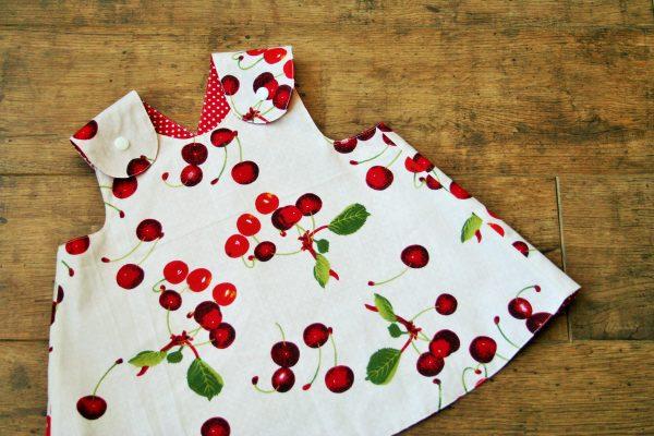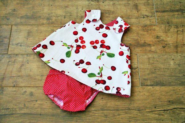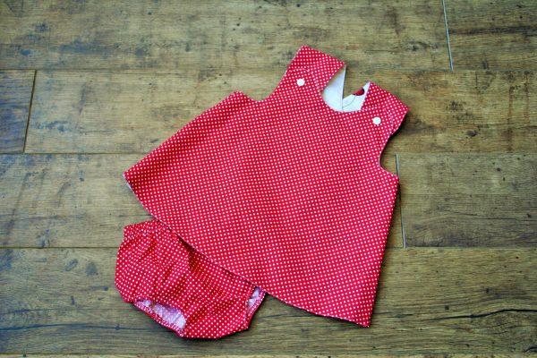 Meggy mintás piros színű kifordítható kötényruha, színben hozzá illő pelenkabugyival. Kényelmes nyári viselet, ideális retro, vintage fotózáshoz is. A webshopban többféle színkombináció elérhető, amennyiben ezektól eltérő mintával szeretne rendelni, kérem email-ben érdeklődjön.