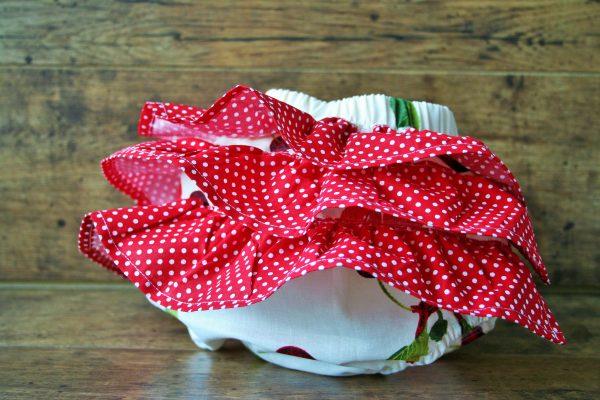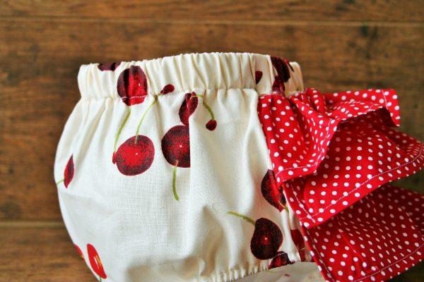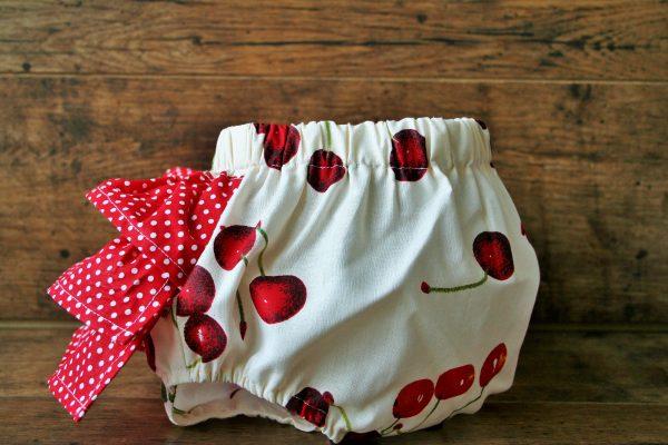Pamutkarton anyagból készült pelenkabugyi, piros pöttyös fodorral. Könnyű nyári viselet, a bugyi miatt a szoknya könnyedén viselhető. A webshopunkban többféle mintában kínálunk pelenkabugyit. Ideális választás babafotózáshoz, retro hangulatot idéző meggyes mintával.