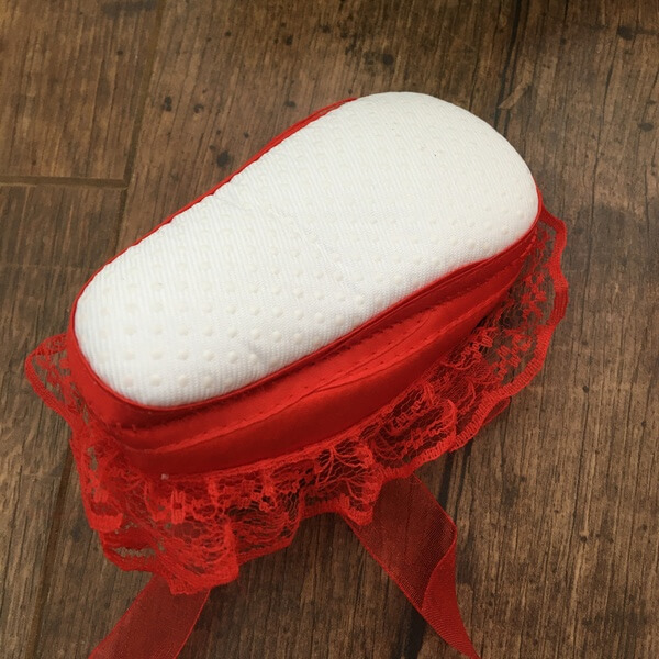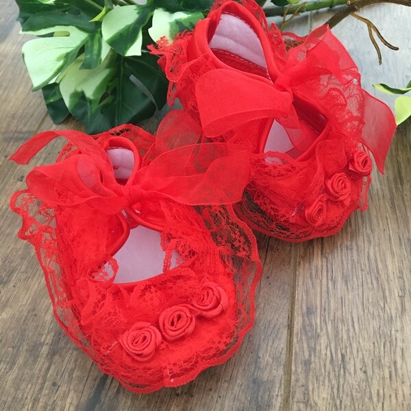 Piros színű szatén kocsicipő nagy csipkével és szatén virágokkal díszítve alkalmakra 0-12 hónapos babák részére. A terméket a méret kiválasztása után tudja kosárba helyezni. Kérjük ellenőrizze gyermeke talpméreteit a további méretptoblémák elkerülése végett. A cipő textilből készült, de gyártói ajánlás alapján nem mosható!