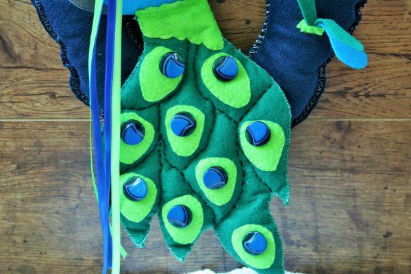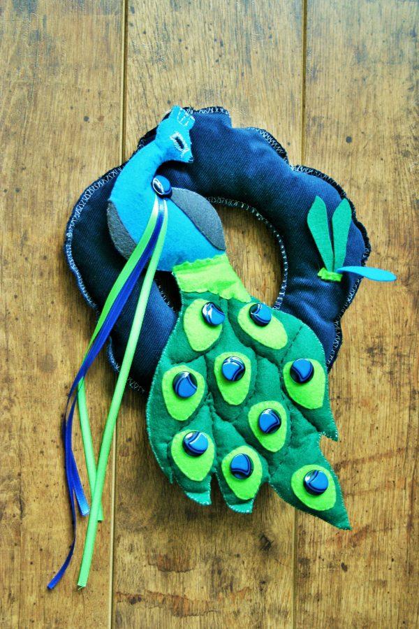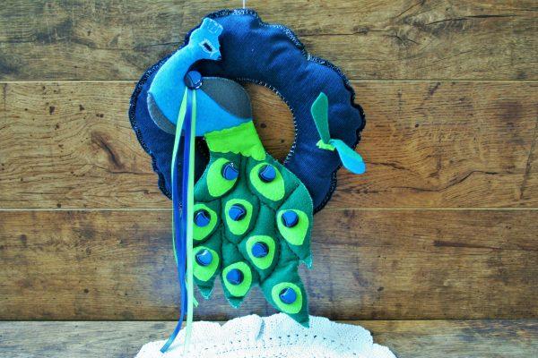 Bejárati ajtóra, lakás díszítésre ajánlott, sötétkék cord bársony alapon pamut anyagból készült koszorú. A páva ajtódísz ideális azoknak, akik szeretik az elegáns stílust, de a country stílusú lakások dísze is lehet ez a gyönyörű koszorú. Az ajtódíszre felvarrt díszek egy páva, gombok és zöld-kék szalag. A koszorú és a filcből kézzel készült díszek párnatöltelékkel vannak töltve. Weshopunk által értékesített ajtódíszek karácsonyi ajándéknak, új lakásba költözőknek kiváló ajándékok lehetnek. A koszorú átmérője 27 cm x 25 cm, súlya 45 gramm.