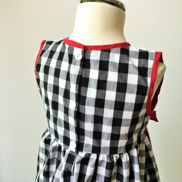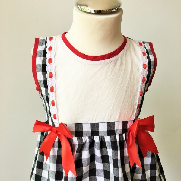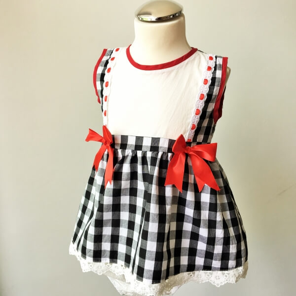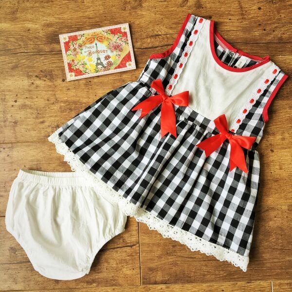 Francia stílusú fekete-fehér kockás alkalmi kislány ruha piros masnival és fehér pelenkatakaró bugyival. A ruha alja és felső része gyönyörű csipkével díszített, háta 3 db gombbal záródikk. Ha elegáns, mégis kicist bohám ruhát keres gyermekének esküvőre, akkor ez a ruha ideális választás lehet.