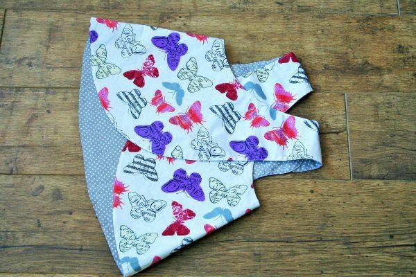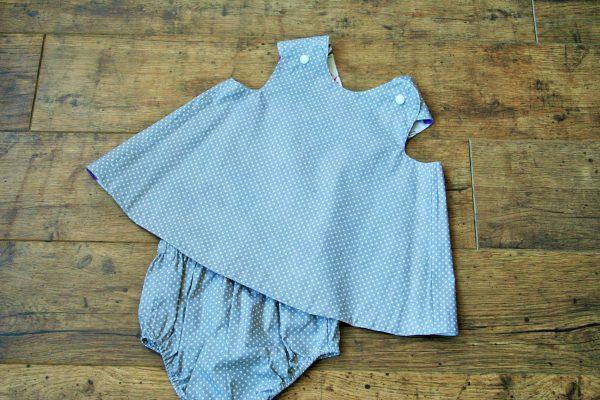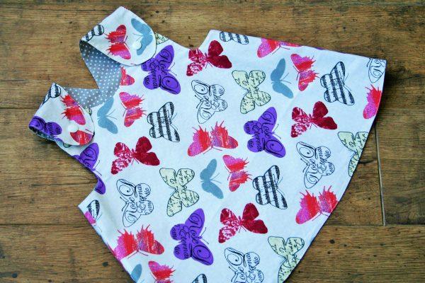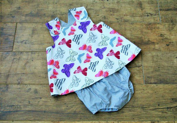 Pillangó mintás lila-pink színű kifordítható kötényruha, színben hozzá illő pelenkabugyival. Kényelmes nyári viselet, ideális retro, vintage fotózáshoz is. A webshopban többféle színkombináció elérhető, amennyiben ezektól eltérő mintával szeretne rendelni, kérem email-ben érdeklődjön.