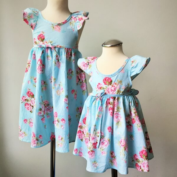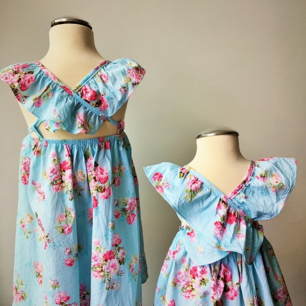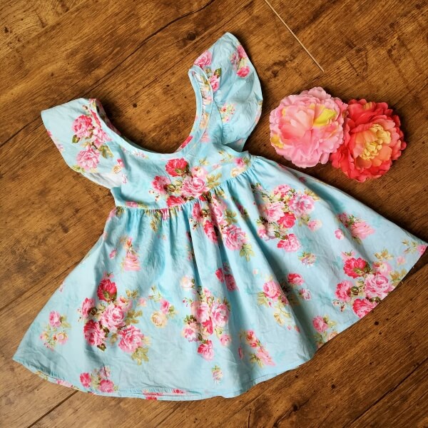 Világoskék alapon gyönyrű pink és rózsaszín rózsákkal díszített kötényruha 1-7 éves kislányoknak. A ruha dereka hátul gumírozott, a vállán fodorral díszített, hátul pedig két bújtatón keresztül vékony pánttal megköthető. Az életkor kiválasztása után látja a derék résztől mért szoknya hosszát.