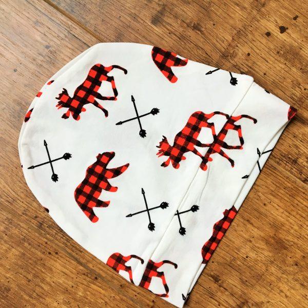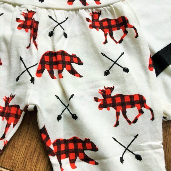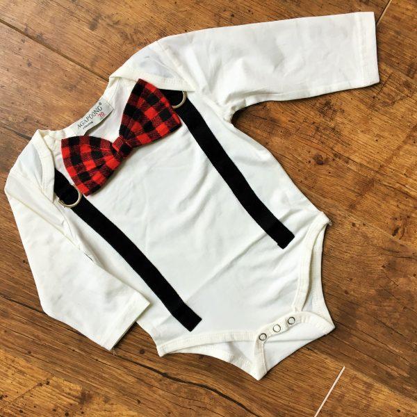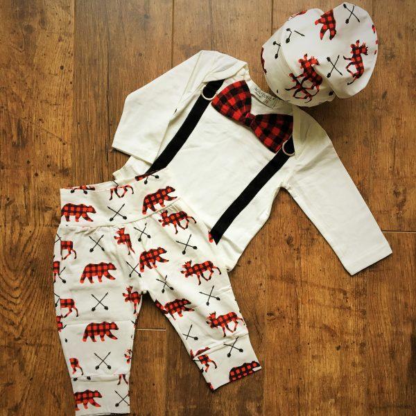 A piros, fekete, fehér színű nyakkendős rénszarvas és medve mintás, 3 részes fiú szett sapkával ajánlott őszi, téli fotózáshoz. A kockás nyakkendő és fekete kantár vagány kiegészítője ennek a kisfiúk részére készült együttesnek, ezek az elemek rá vannak varrva a fehér színű body-ra. A sapka és nadrág azonos anyagból készültek és erdei favágó stílusú képek vagy Karácsonyi fotók készítéséhez is ideális ez a kisfiú gyerekruha.