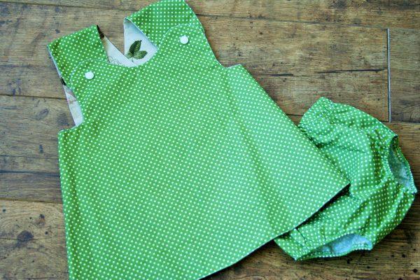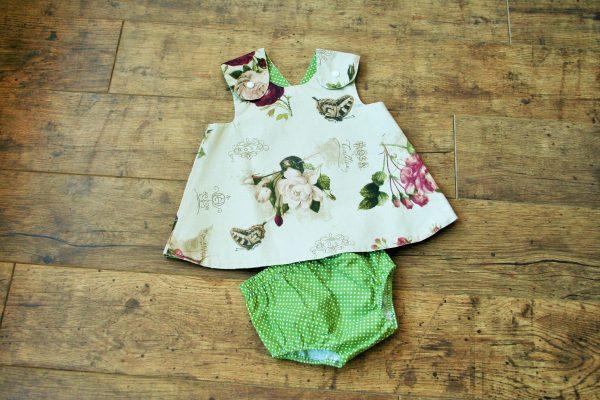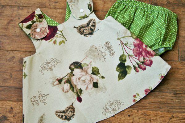 Rózsás zöld színű kifordítható kötényruha, színben hozzá illő pelenkabugyival. Kényelmes nyári viselet, ideális retro, vintage fotózáshoz is. A webshopban többféle színkombináció elérhető, amennyiben ezektól eltérő mintával szeretne rendelni, kérem email-ben érdeklődjön.