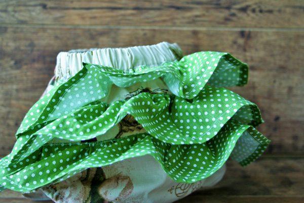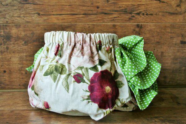 Rózsa mintás pamutkarton anyagból készült pelenkabugyi, zöld pöttyös fodorral. A bugyi babafotózási kellékként használható, vintage stílusú születésnapi babafotók készítéséhez ajánlott.