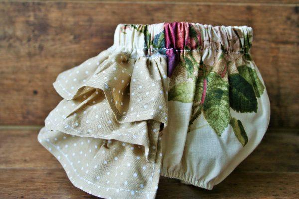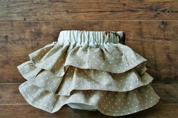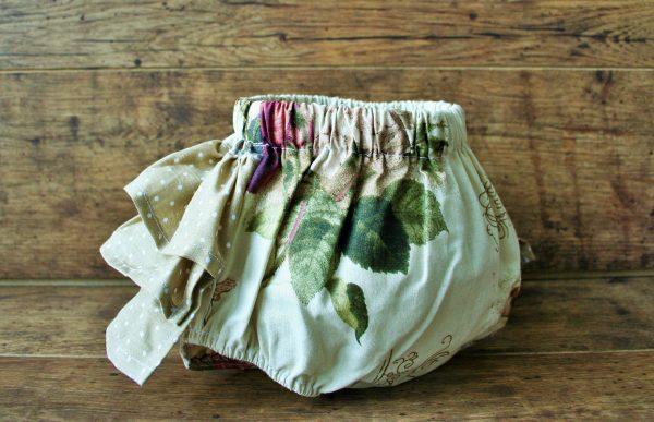 Rózsa mintás pamutkarton anyagból készült pelenkabugyi, barna pöttyös fodorral. Könnyű nyári viselet, akár egy bézs színű felsővel is használható. A bugyi babafotózási kellék, rózsás mintája miatt vintage stílusú babafotók készítsére ajánlott.