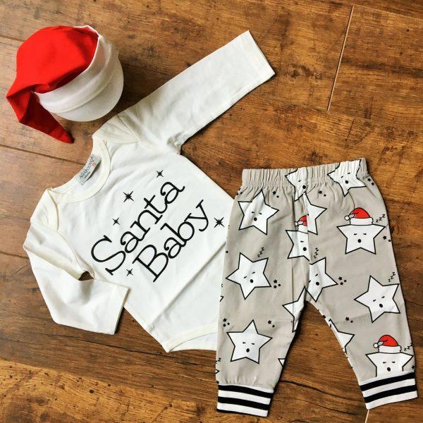 A ‘Santa Baby’ feliratos 3 részes Mikulás szett fiúk részére, piros sapkával Karácsonyra vagy Mikulásra ajánlott gyerekruha. A szürke alapon fehér csillagos nadrághoz és a feliratos, hosszú ujjú fehér bodyhoz tartozik egy nagyon szép piros mikulás sapka. Ünnepi fotók készítéséhez kelléknek vagy akár ajándéknak is vásárolhatja ezt a gyönyörű alkalmi együttest babáknak.