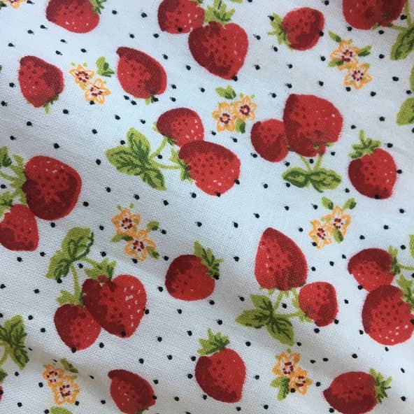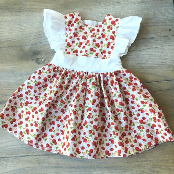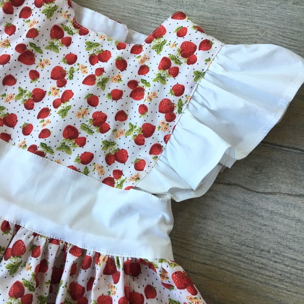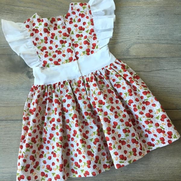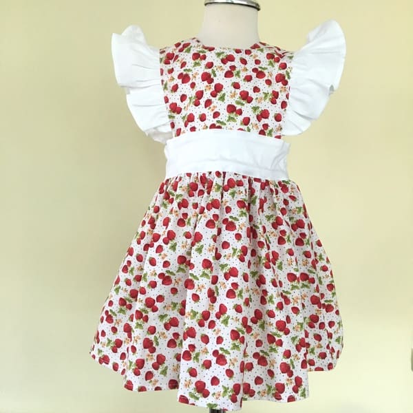 Szamóca (eper) mintás kötényruha fehér fodorral és övrésszel. A ruha felső része bélelt, hátul 3 db patenttal záródik és oldalt nyitott. A pontos méretek az életkor kiválasztása után jelennek meg.