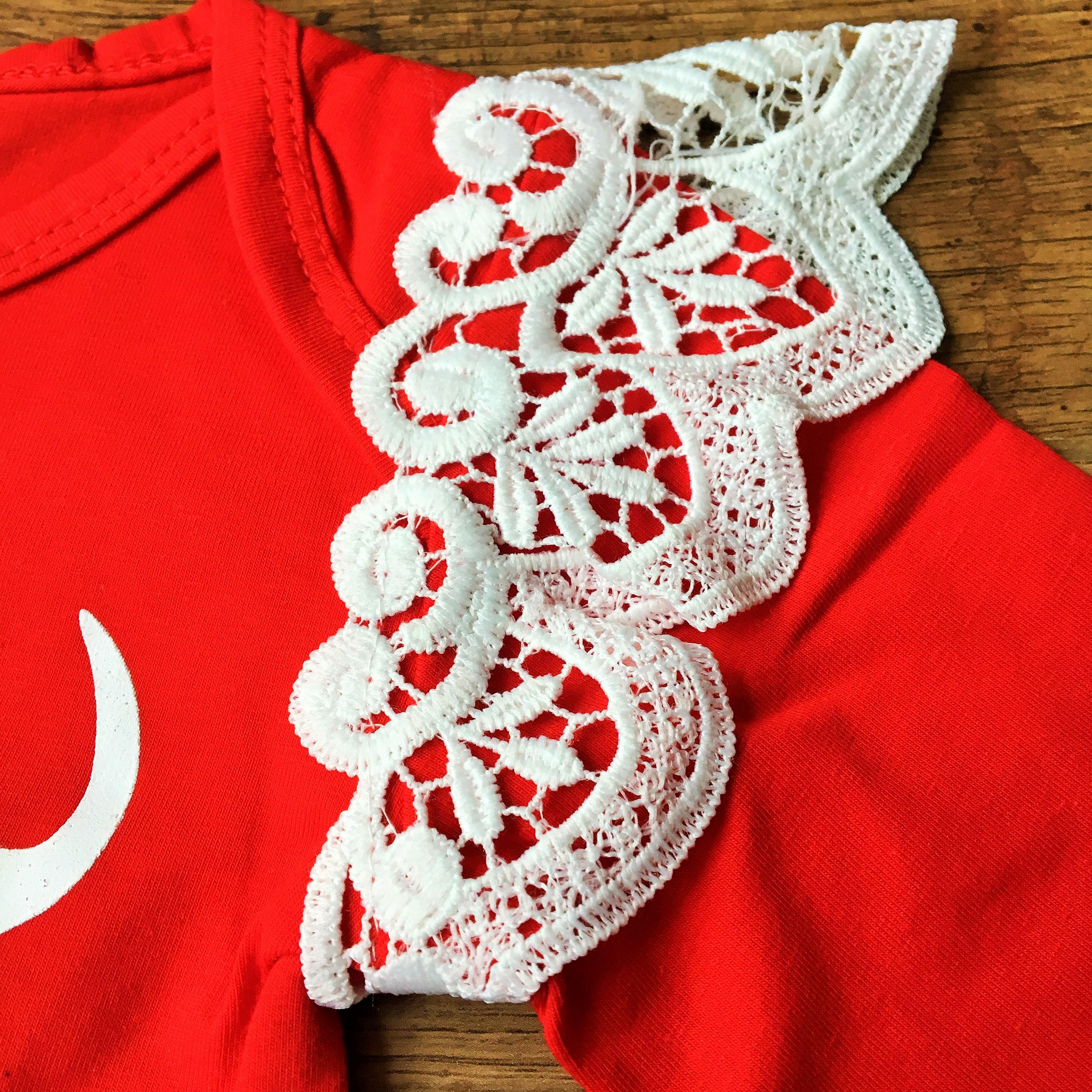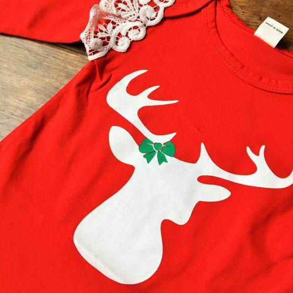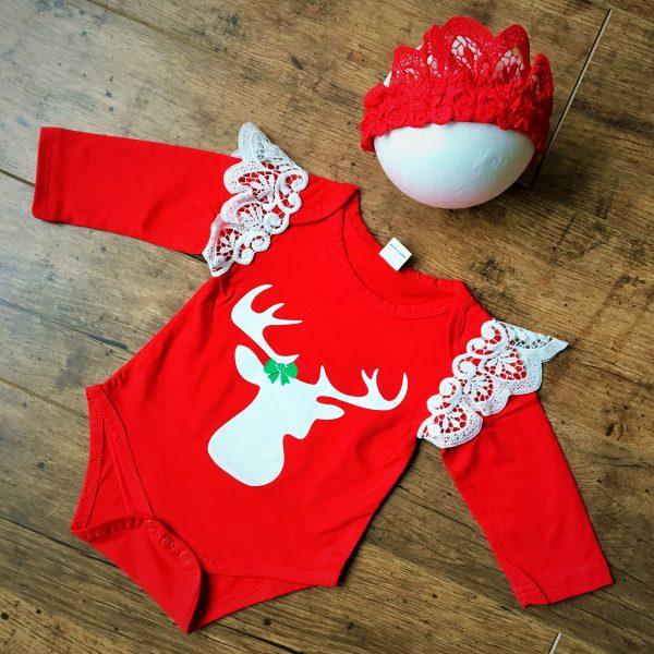 Szarvas mintás piros színű body szabású gyerekruha, ajánlott Karácsonyra, Mikulásra a gyerekfotózáshoz. A hosszú ujjú body vállán fehér rávarrt csipke található, a szarvas fej pedig rávasalt matricaként került felhelyezésre. Az ár tartalmazza a gumis, sipkével díszített fejpántot is. A felsőhöz webshopunkban talál többféle tütü szoknyát, amellyel akár tetszőleges fotó szettet is össze tud állítani kislánya számára.