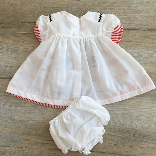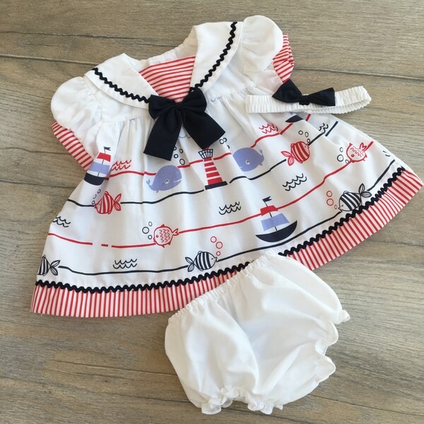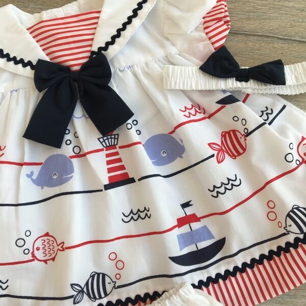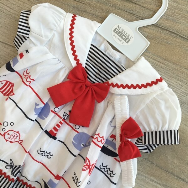 Elegáns 3 részes tengerész szett babák részére. A szett kétféle verzióban rendelhető piros (1-es típus) vagy kék (2-es típus) masnival. A ruha elején tengeri minta, halak, hajók találhatóak, elején masni, a gallér és alsó rész is díszített. A ruha háta fehér színű és 2 db gombbal záródik. A szetthez tartozik egy fehér pelenkatakaró bugyi és egy masnis gumírozott fejpánt. Pontos centiméter adatok az életkor kiválasztása után jelennek meg.