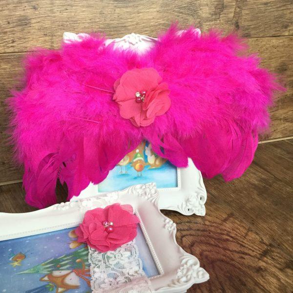 Pink színű tollas angyalszárny és fejdísz babafotózáshoz. A rugalmas csipke szalagon kövekkel és gyönggyel díszített chiffon virág található, hétköznapi használatra nem ajánlott a fotószett. A szárny gumival a vállakhoz rögzíthető így akár nagyobb babák is használhatják. Amennyiben a termék nincs raktáron, a rendelés részleteiről a kapcsolat menüben kérem érdeklődjön.